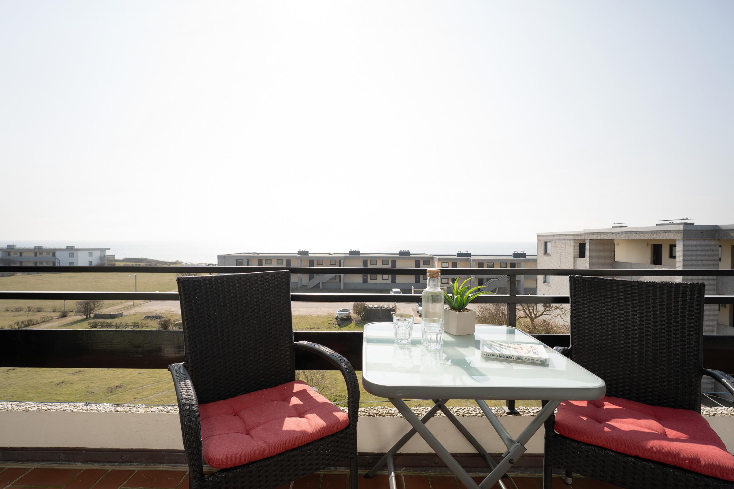 An der schönen Südküste der Insel Fehmarn: Die traumhafte, ca. 51 m² große 3-Zimmer-Ferienwohnung mit umlaufendem Balkon und Meerblick befindet sich im 2. Stock und ist für bis zu 4 Personen geeignet.