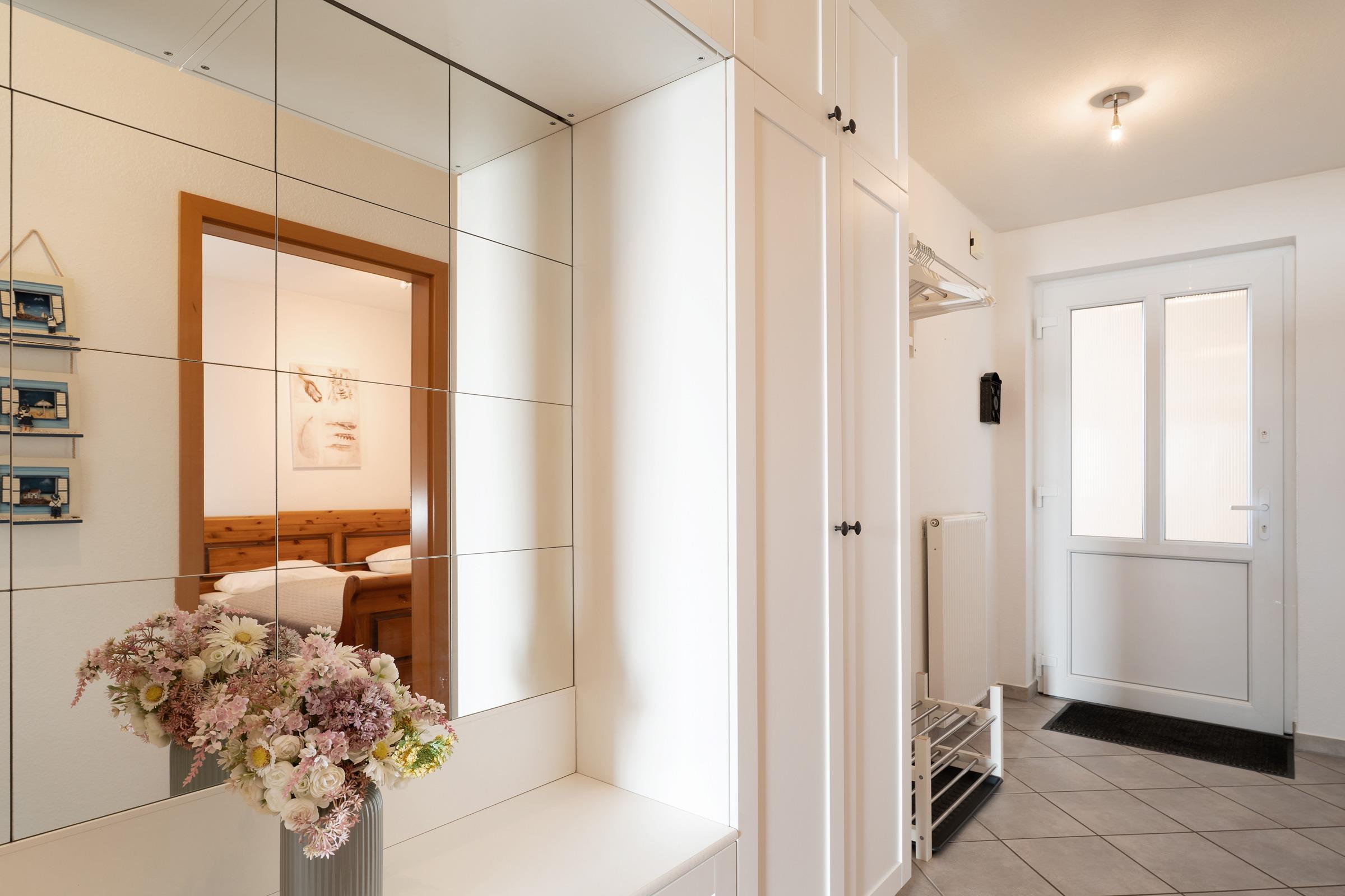 Strandnah im idyllischen Staberdorf: ruhige 2-Zimmer-Ferienwohnung mit ca. 43 m² Wohnfläche im 1. Stock mit Balkon für bis zu 2 Erwachsene und 1 Kind mit direktem Meerblick.