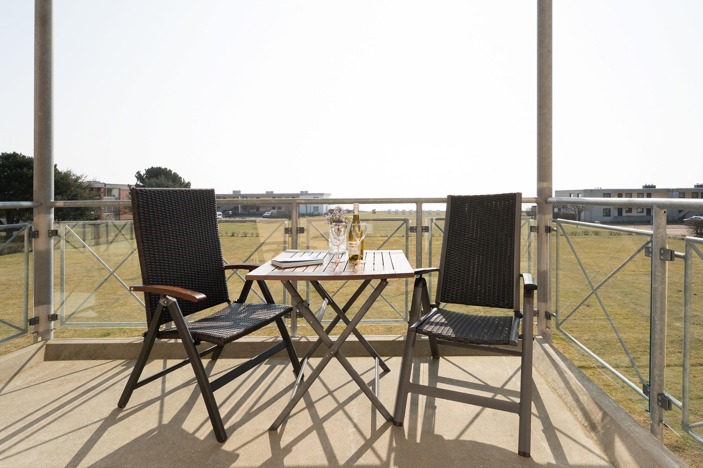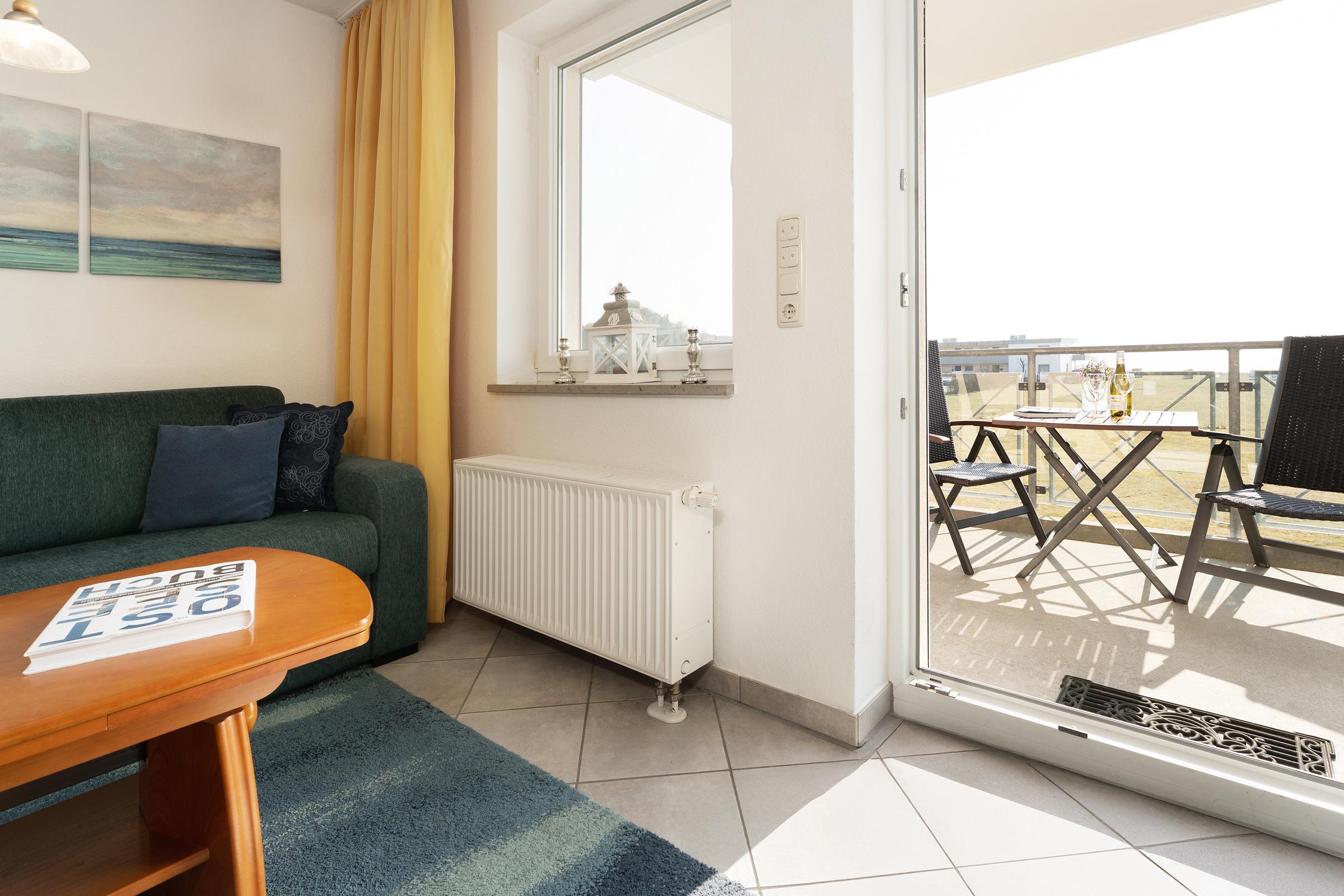 Nur rund 100 Meter von der Ostsee entfernt befindet sich diese schöne Wohnung in der Wohnanlage Ferienresidenz. Im gemütlich eingerichteten Wohnbereich erwartet Sie eine ausziehbarer Schlafcouch, die bei Bedarf als ein Schlafplatz fungiert, eine Essecke sowie eine offener Küchenzeile. Ein Fernseher mit Sat-Anschluss ist vorhanden. Das Schlafzimmer ist mit einem großen Doppelbett (200x200 cm) ausgestattet und garantiert geruhsame Nächte. Das innenliegende Duschbad ist hell gefliest und hat einen Handtuchwärmer. Das Highlight dieser Wohnung ist sicher der möblierte Balkon mit direktem Meerblick. Genießen Sie die Sonne von früh bis spät.