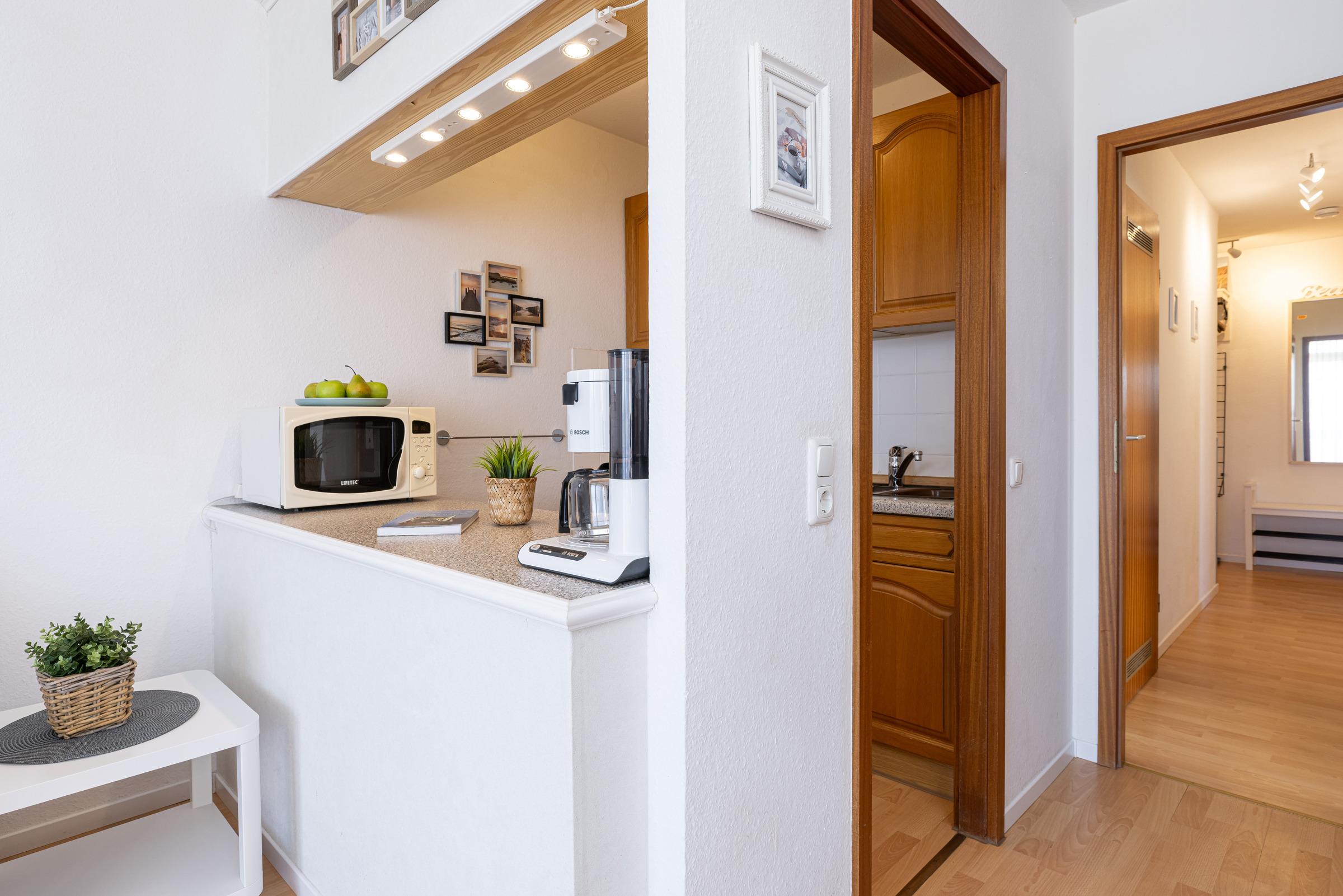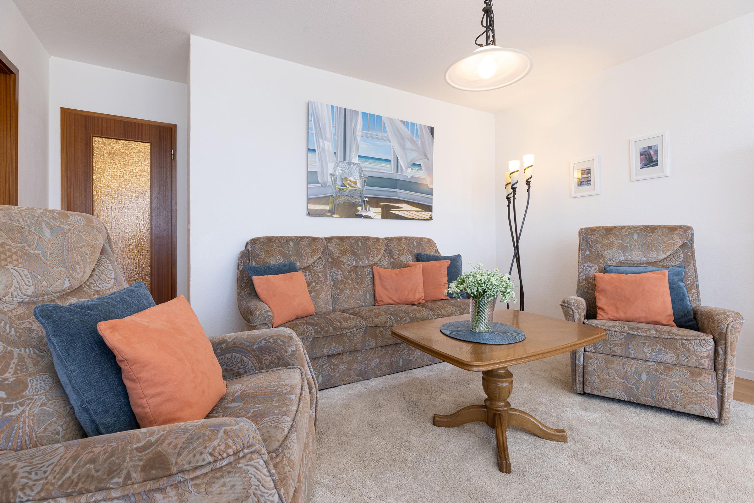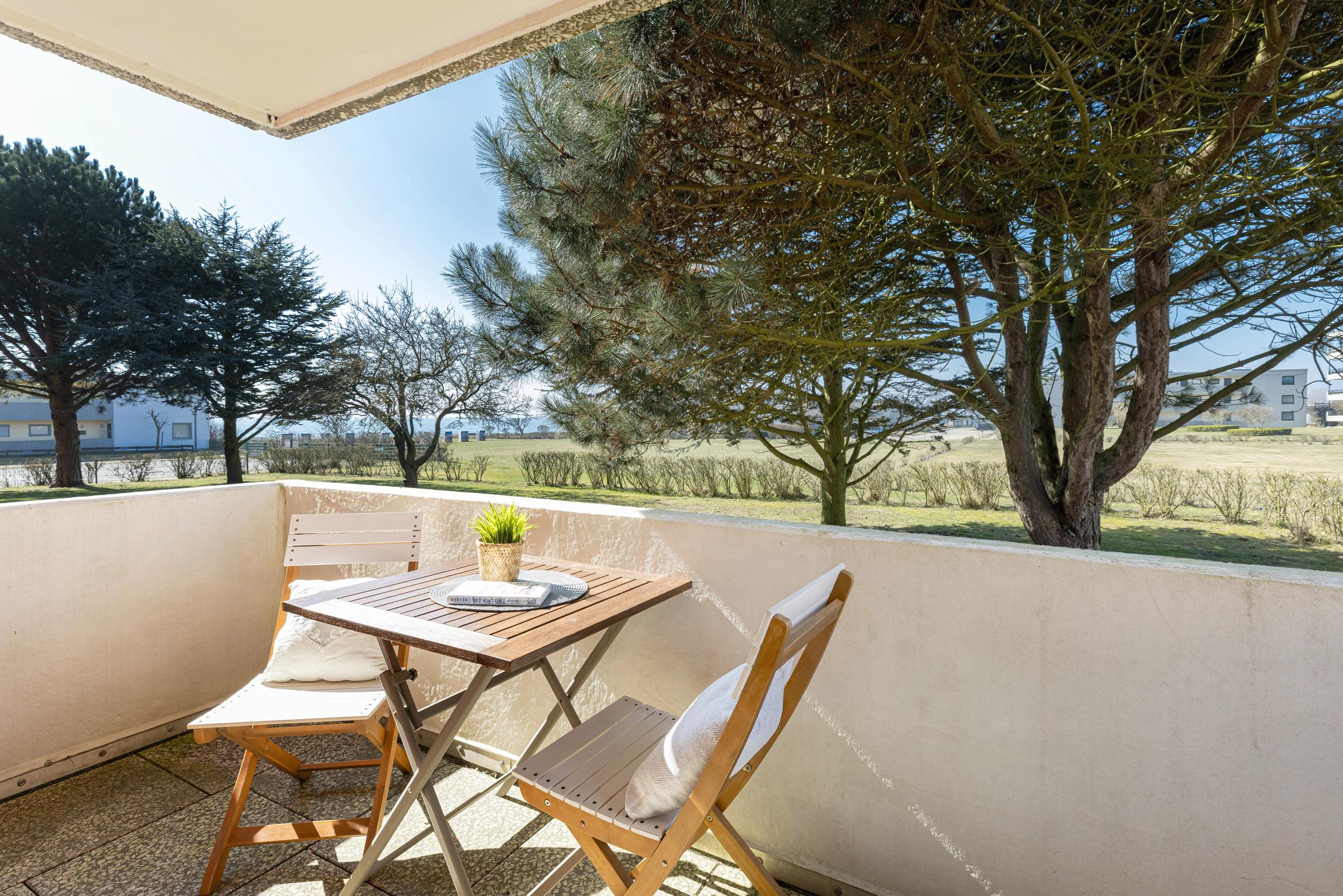 Nur rund 100 Meter vom Strand entfernt ... Das Wohnzimmer verfügt über bequeme Sitzgelegenheiten. Die offene Küche ist in den Wohnraum integriert. Dort befindet sich ein Herd mit Cerankochfeld, ein Backofen und ein Geschirrspüler. Das Highlight dieser Wohnung sind der Meerblick und die beiden Balkone. Der größere Balkon ist nach Osten ausgerichtet, hier haben Sie vom Frühstück bis zum Mittag die Sonne. Ab frühem Nachmittag bis zum Abend können Sie die Sonne auf dem kleineren West-Balkon genießen. Für die Nacht stehen Ihnen ein Schlafzimmer mit Doppelbett und ein weiteres Schlafzimmer mit Hochbett zur Verfügung. Eine 5. Schlafgelegenheit für ein Kind ist das ausziehbare Lattenrost mit Matratze unter dem Hochbett. Das hell geflieste Duschbad punktet mit einem Handtuchwärmer.
