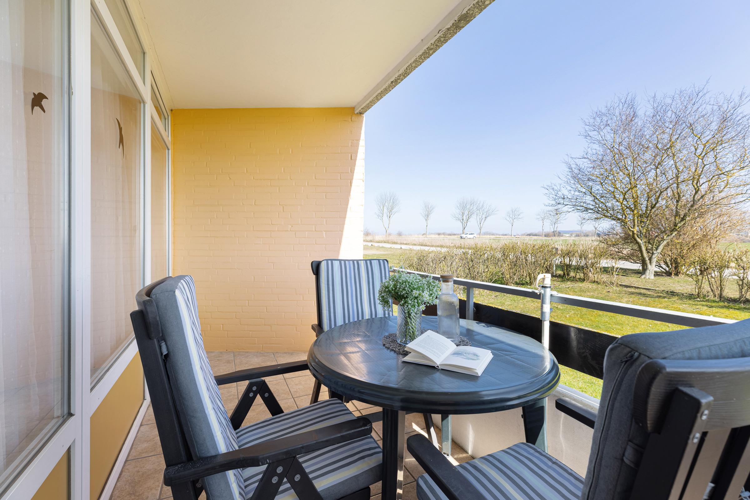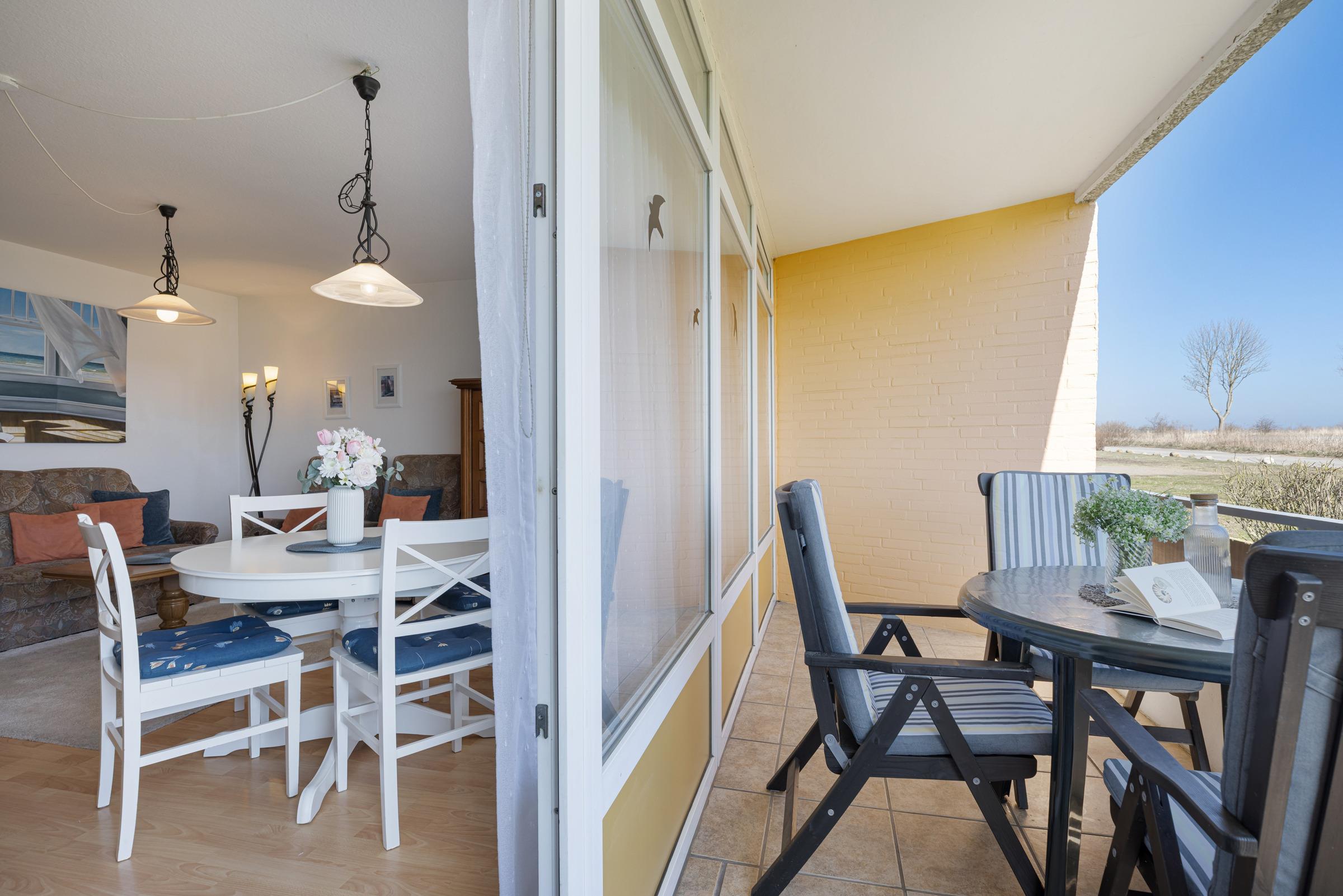 Strandnah im idyllischen Staberdorf in der Wohnanlage Ferienresidenz: charmante, ca. 63 m² große 3-Zimmer-Ferienwohnung für bis zu 4 Erwachsene und 1 Kind im Hochparterre direkt am Wasser mit zwei Balkonen und direktem Meerblick.