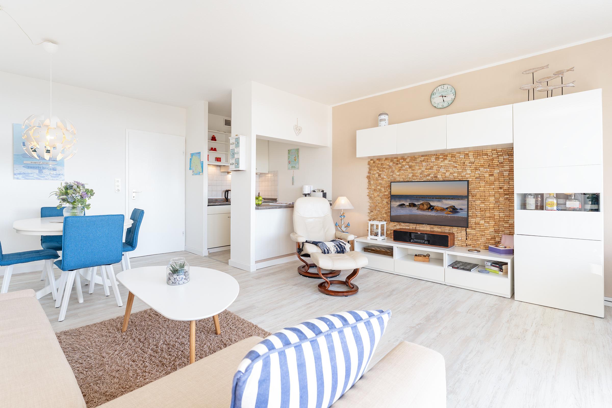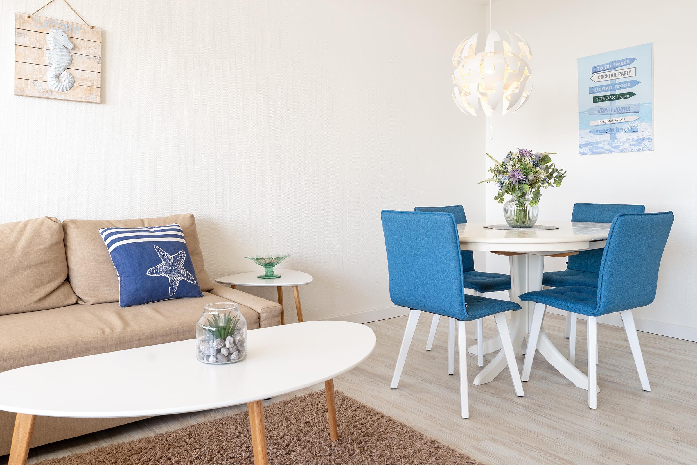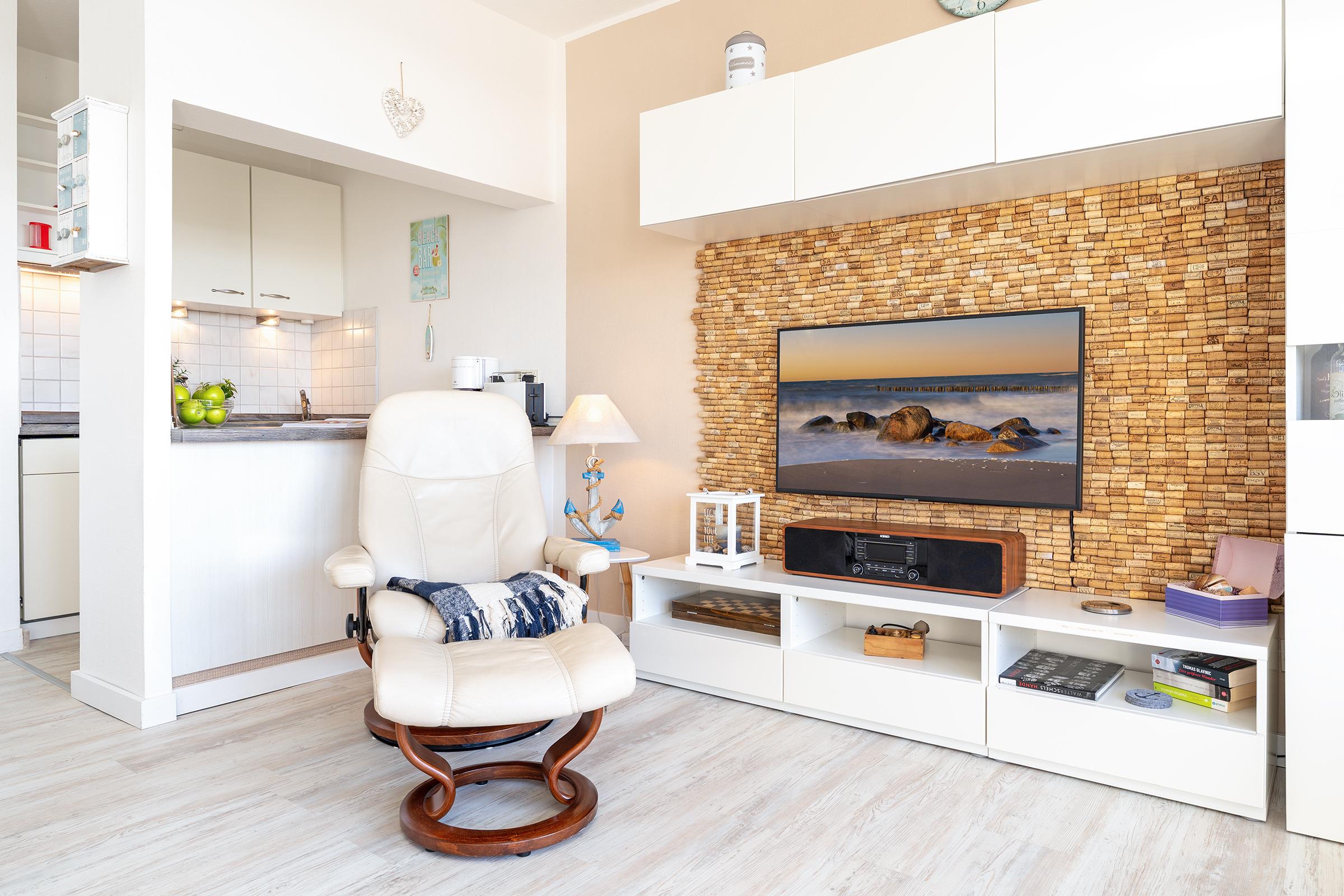 Hereinspaziert! Genießen Sie den traumhaften Blick auf die Ostsee aus dem großzügigen Wohn-Essbereich sowie vom überdachtem, möblierten Balkon aus. Ihr Urlaub kann beginnen. Der geschmackvoll eingerichtete Wohnbereich ist mit einer gemütlichen Schlafcouch, einem Smart-TV sowie einer netten Essecke ausgestattet. In der halb offenen Küche können Sie neue Rezepte der Region ausprobieren. Eine Spülmaschine übernimmt anschließend den Abwasch. Traumhaft nächtigen werden Sie im separaten Schlafzimmer im kuscheligen Doppelbett (140x200 cm). Das hell geflieste Duschbad bringt Sie gut in den neuen Tag. Der nahegelegene Naturstrand lädt zum Baden ein, aber auch Wassersportliebhabern bietet er viele Möglichkeiten. Auf dem fußläufig erreichbaren Campingplatz finden Sie einen Supermarkt sowie Restaurants und Spielmöglichkeiten für Kinder.