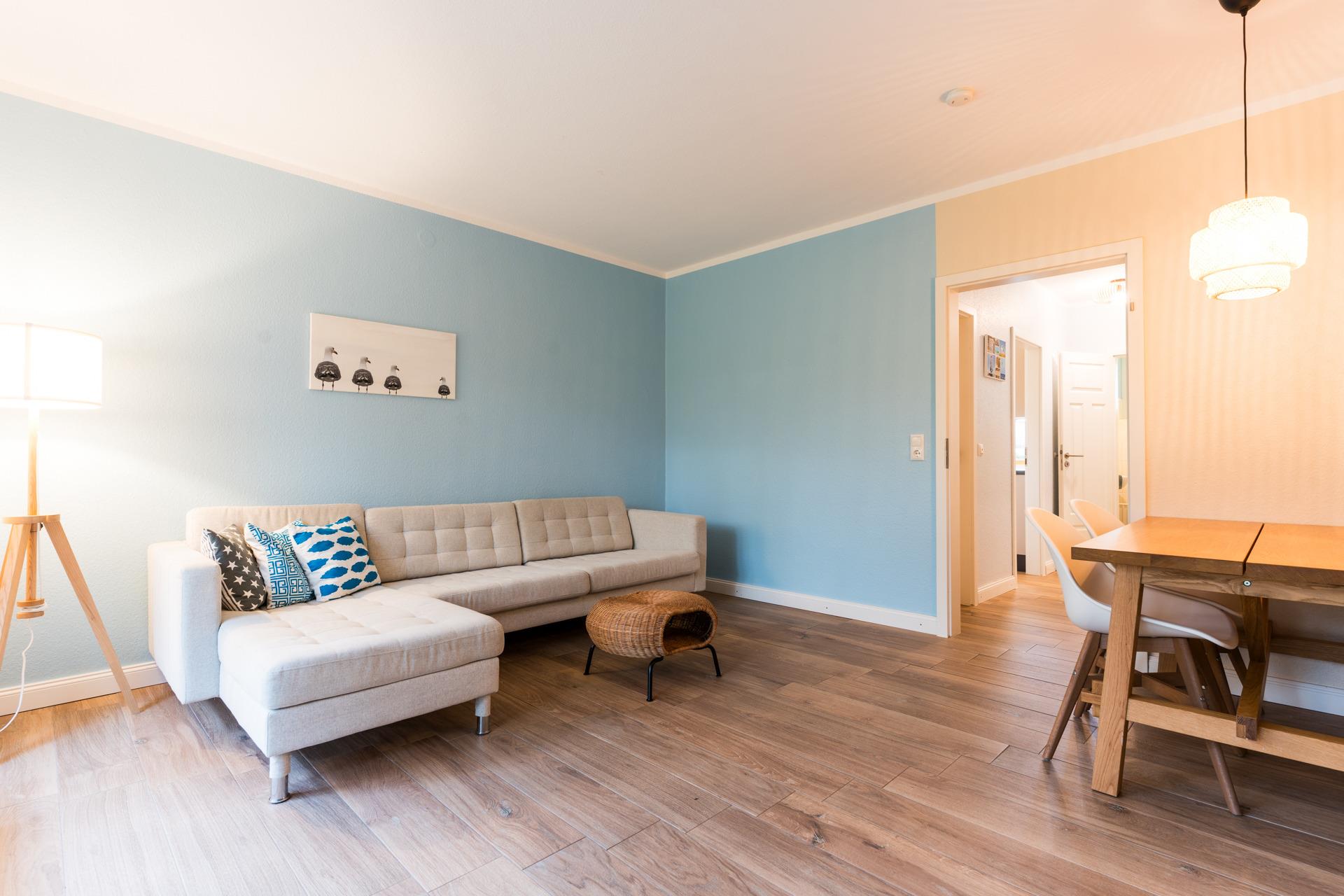 Im sonnigen Wohnzimmer mit Essecke erwartet Sie ein Flachbild-TV mit DVD Player, ein Radio mit CD Player sowie ein gemütliches Sofa zum Relaxen.