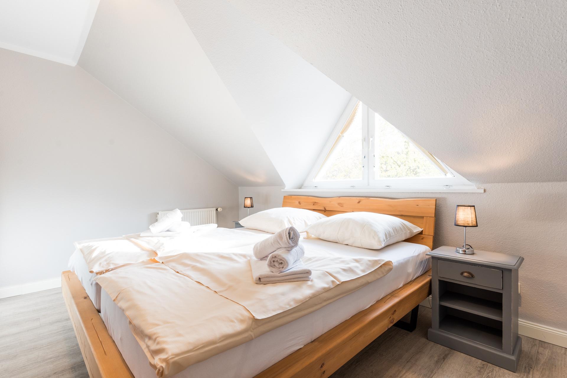 Ein Schlafzimmer mit 1 Doppelbett und ein Kinderzimmer mit 2 Einzelbetten befinden sich im Obergeschoss, ebenso ein Badezimmer mit Dusche.