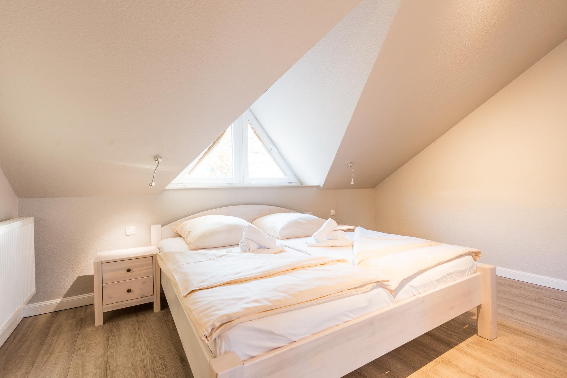 Ein Schlafzimmer mit 1 Doppelbett und ein Kinderzimmer mit 2 Einzelbetten befinden sich im Obergeschoss, ebenso ein Badezimmer mit Dusche.