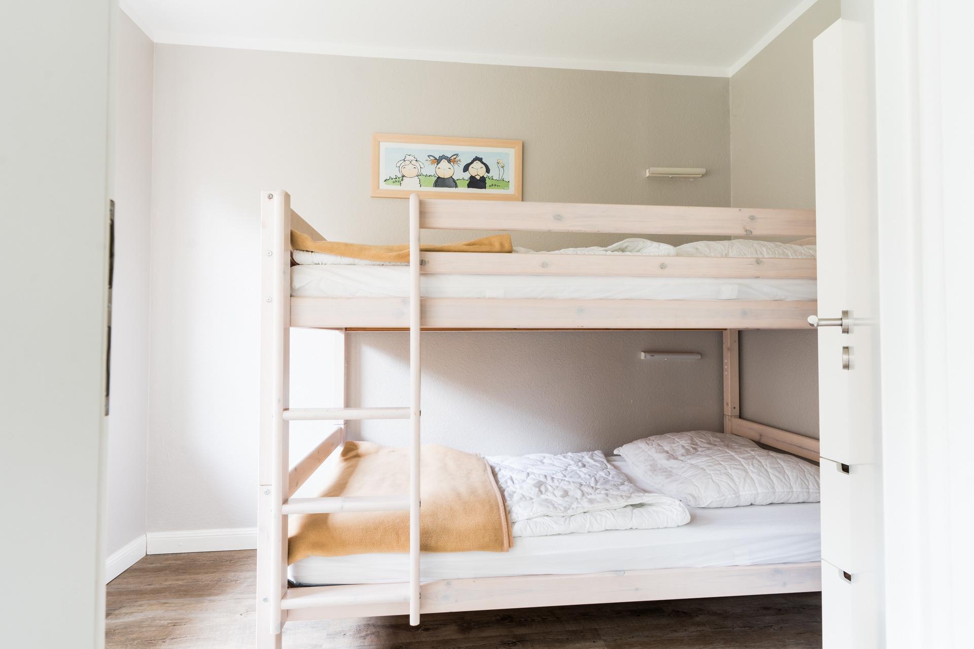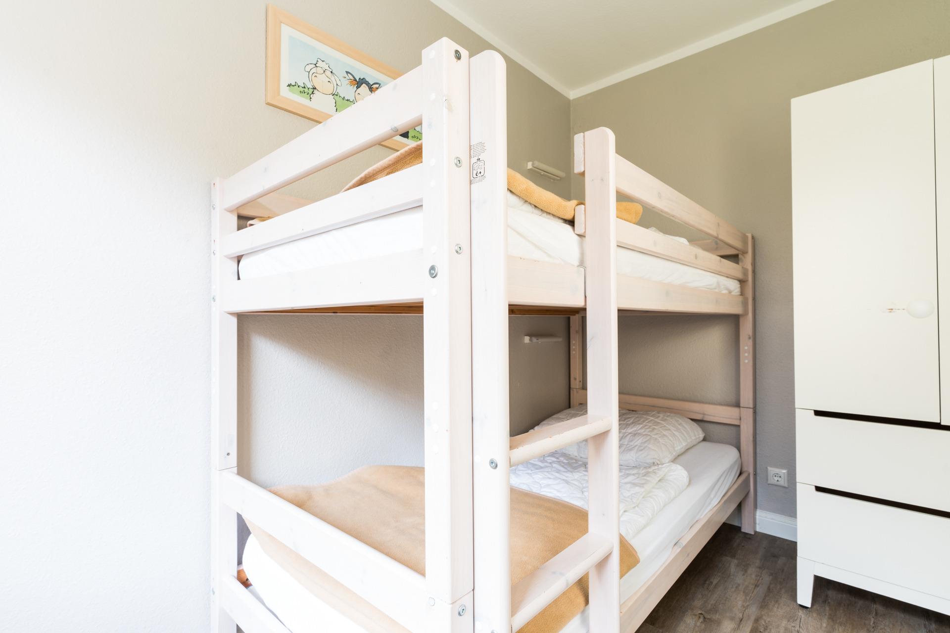 Ein Elternschlafzimmer mit 1 Doppelbett und ein Kinderzimmer mit 1 Etagenbett.
