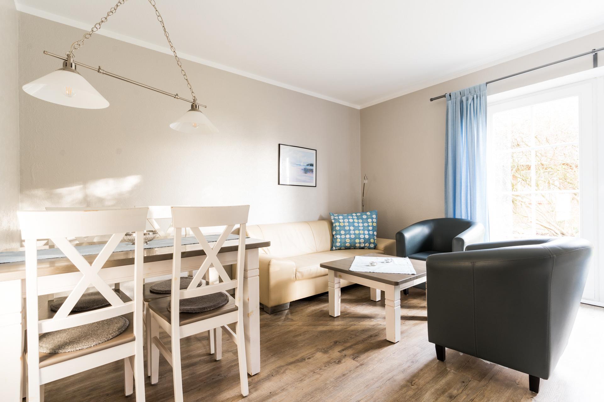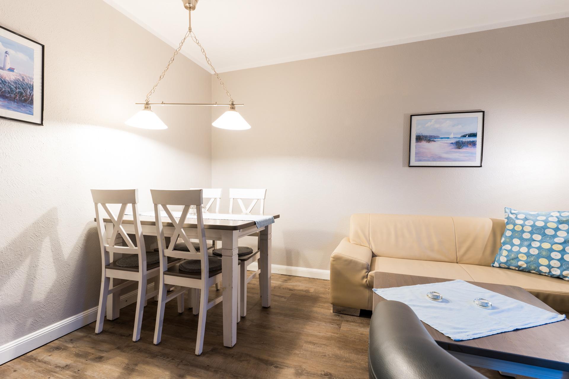 Im hellen Wohn-Ess-Zimmer erwarten Sie ein Flachbid-TV mit DVD-Player, ein Radio und ein CD-Player.
