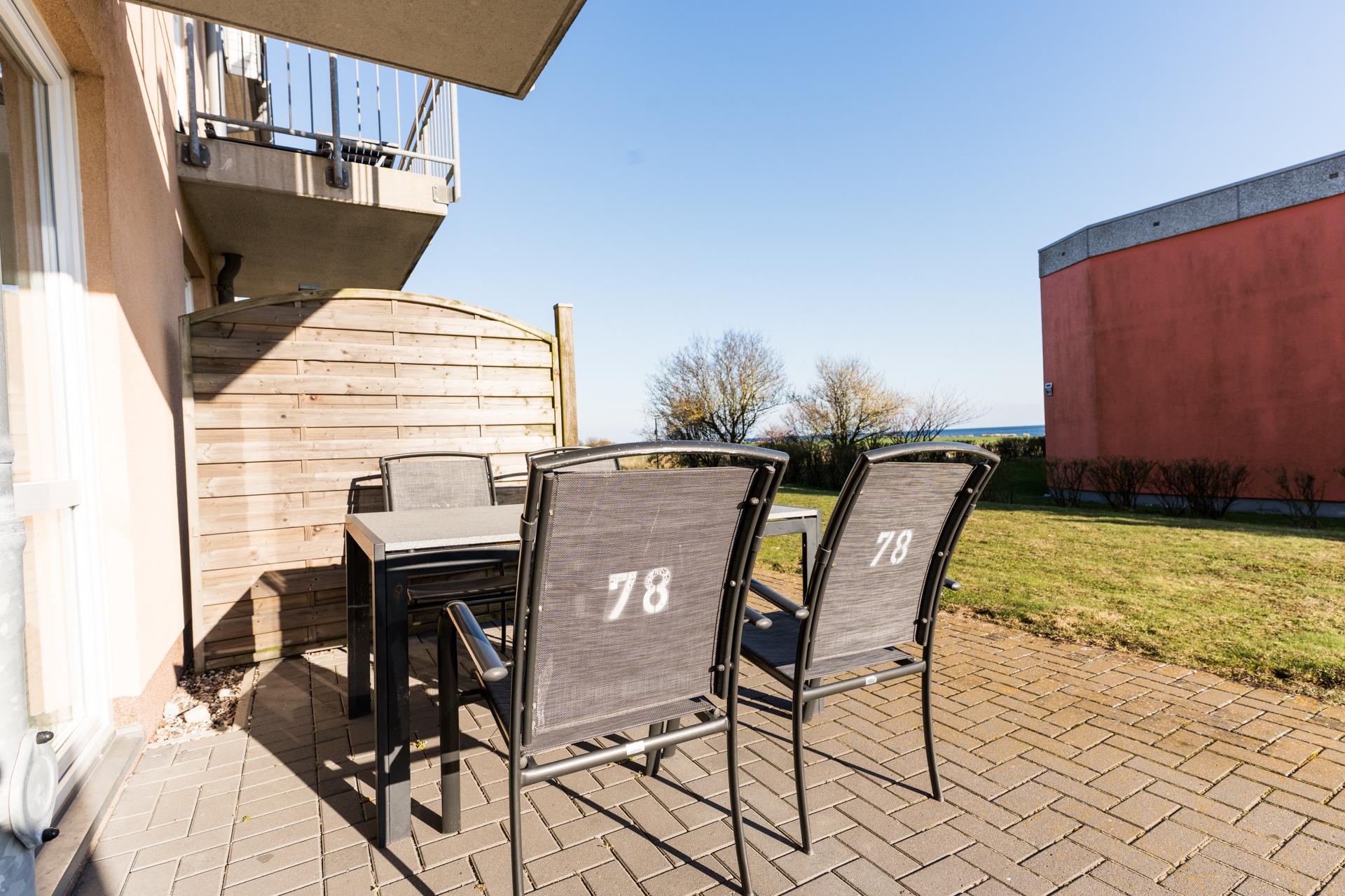 Genießen Sie den Meerblick vom möblierten Balkon aus oder entspannen Sie im Strandkorb direkt an der Düne.