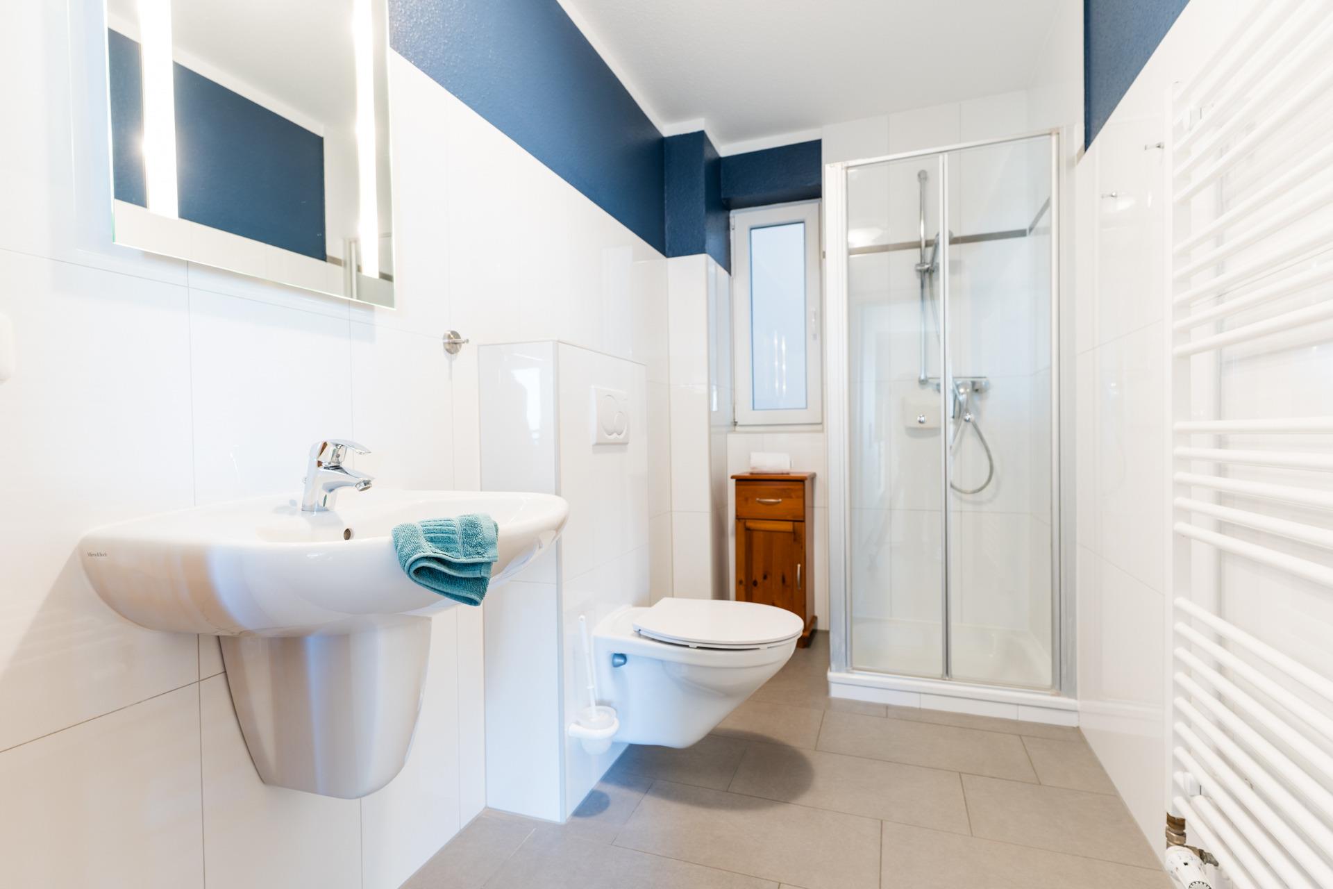 Das moderne Badezimmer mit Dusche verfügt über einen Handtuchheizkörper und Fußbodenheizung.