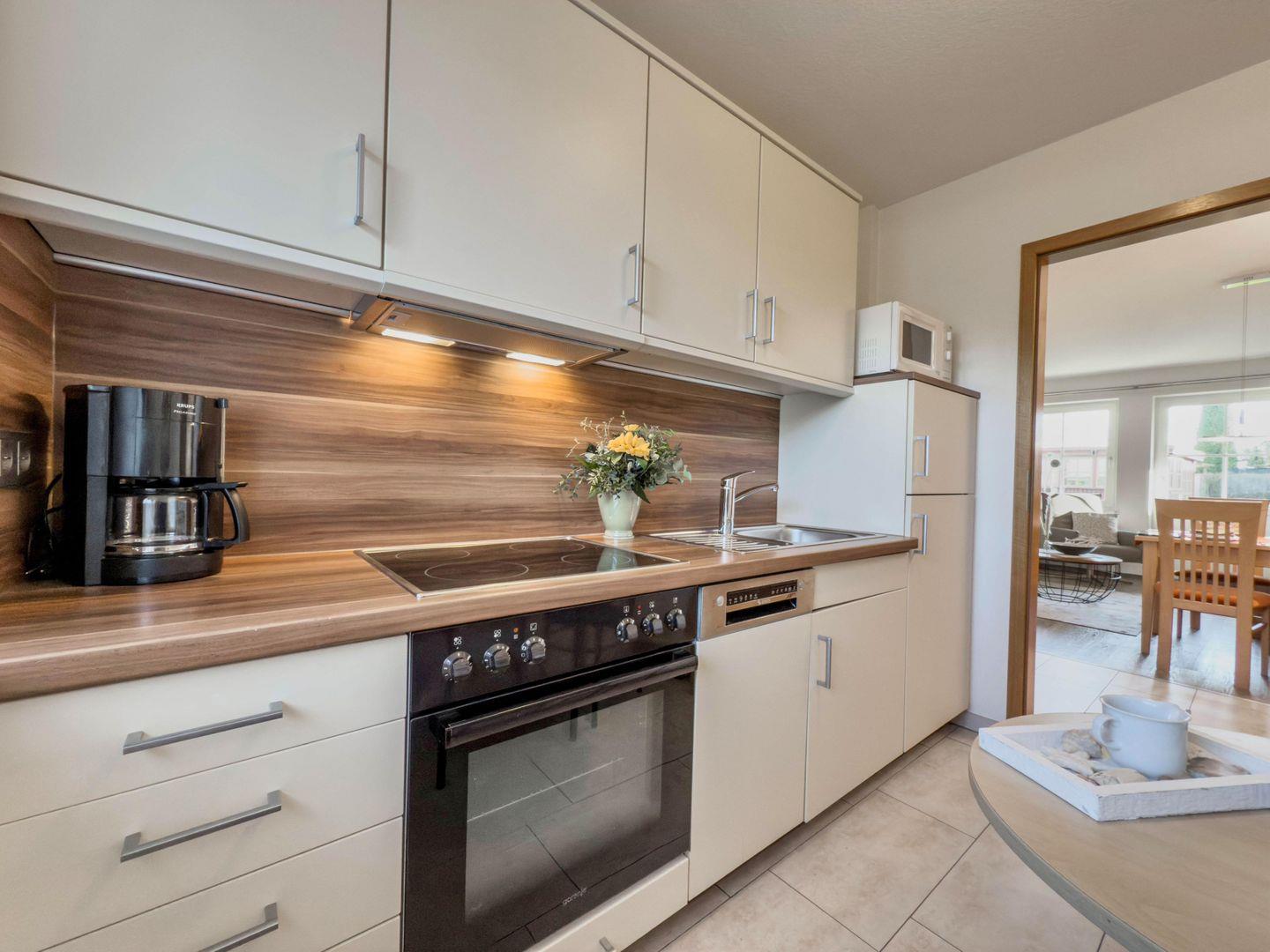 In dieser Wohnung finden Sie eine moderne und gleichzeitig gemütliche Atmosphäre vor. Die Fernsehecke ist mit Sofa, Sesseln und Couch eingerichtet. Der geräumige Küchenbereich ist mit allen notwendigen Küchenutensilien ausgestattet.