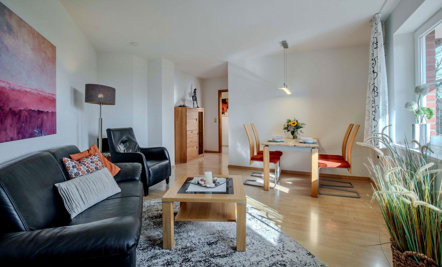 In dieser Wohnung finden Sie eine moderne und gleichzeitig gemütliche Atmosphäre vor. Die Fernsehecke ist mit Sofa, Sesseln und Couch eingerichtet. Der geräumige Küchenbereich ist mit allen notwendigen Küchenutensilien ausgestattet.