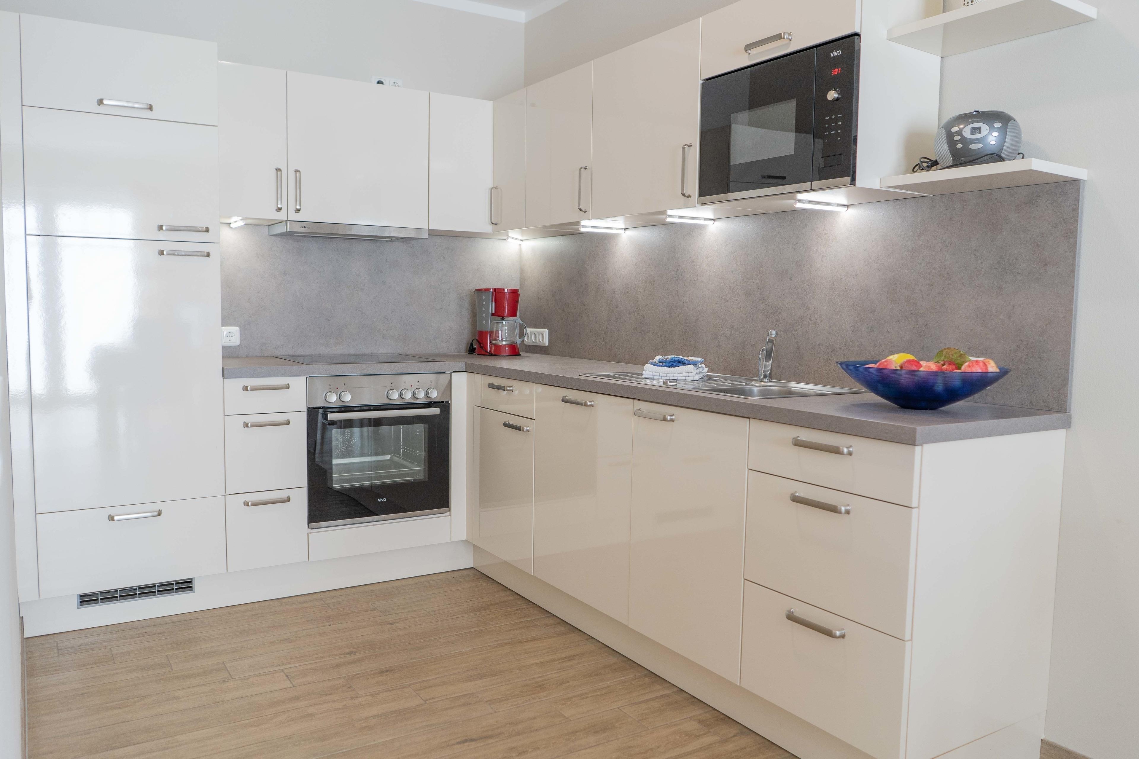 Wohnraum mit Sitzgruppe und Essplatz, WLan, Flachbildfernseher, direkter Zugang zur Südterrasse, voll ausgestattete Küche, Herd mit Ceran-Kochfeld und Backofen, Mikrowelle, Geschirrspüler, Tiefkühlfach, Kaffeemaschine, Wasserkocher, Toaster usw.