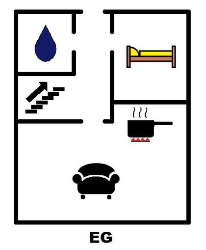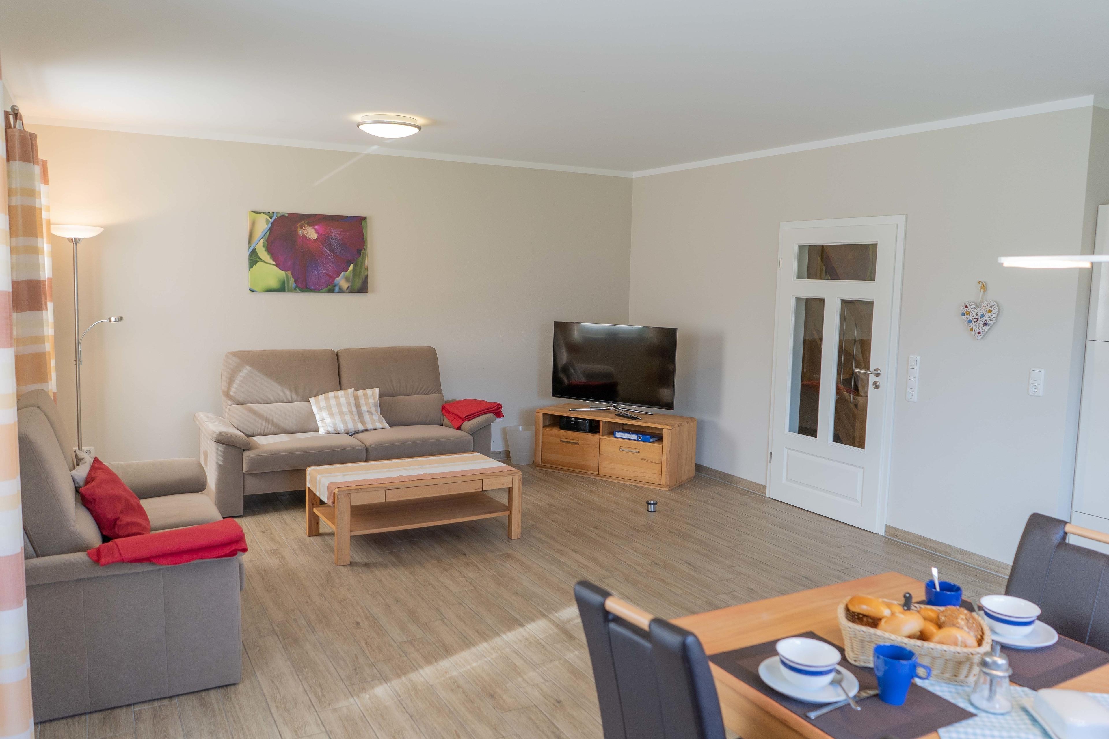 Wohnraum mit Sitzgruppe und Essplatz, WLan, Flachbildfernseher, direkter Zugang zur Südterrasse, voll ausgestattete Küche, Herd mit Ceran-Kochfeld und Backofen, Mikrowelle, Geschirrspüler, Tiefkühlfach, Kaffeemaschine, Wasserkocher, Toaster usw.
