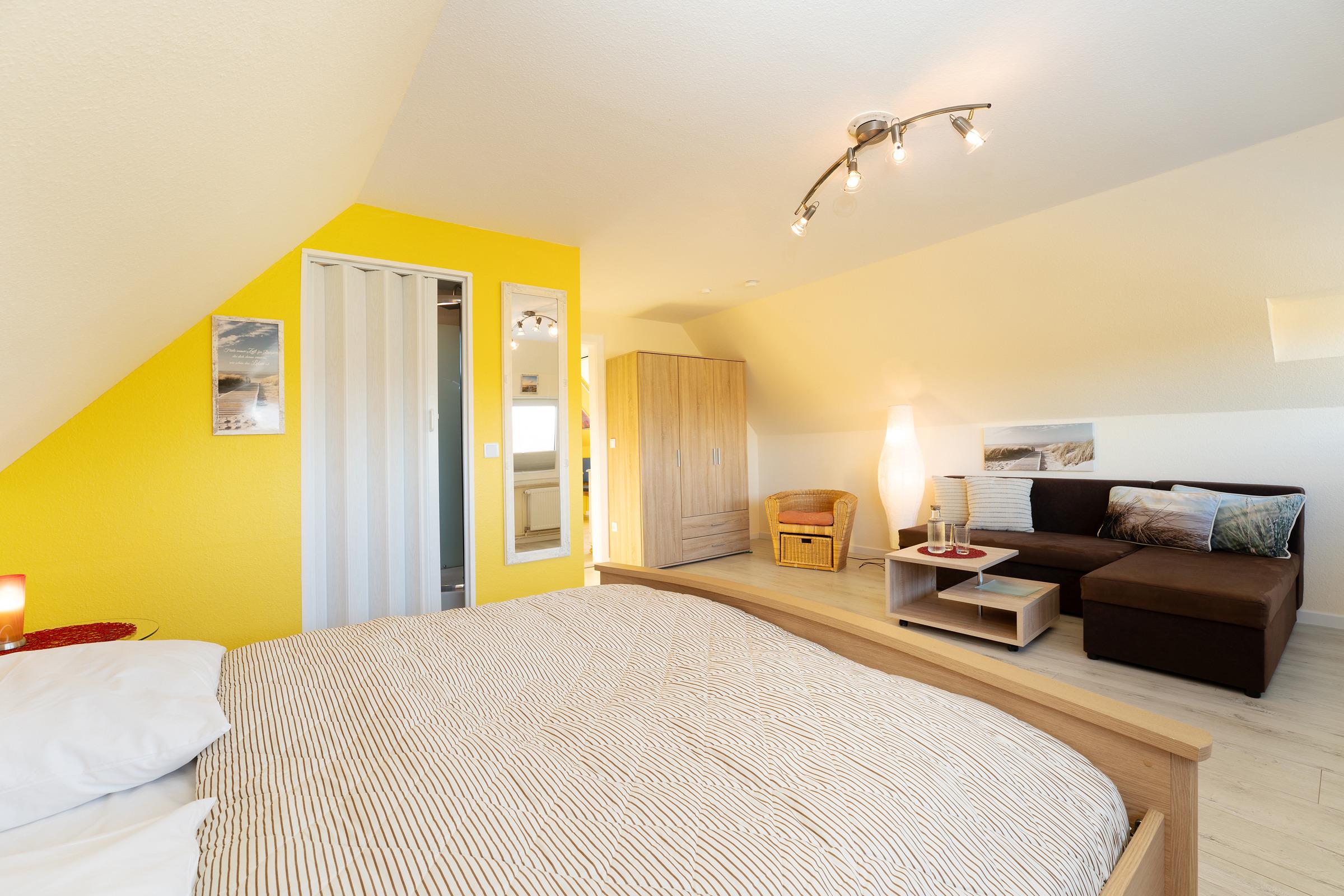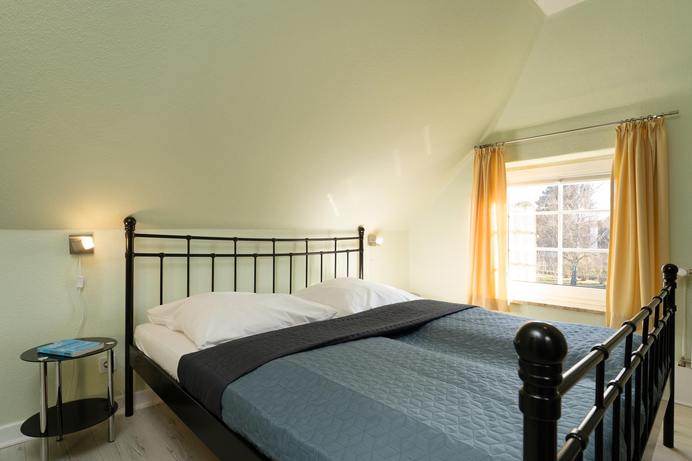 Schlafzimmer 2: 1 Doppelbett, Verdunkelung: Gardinen, Kleiderschrank, Platz für Babybett vorhanden