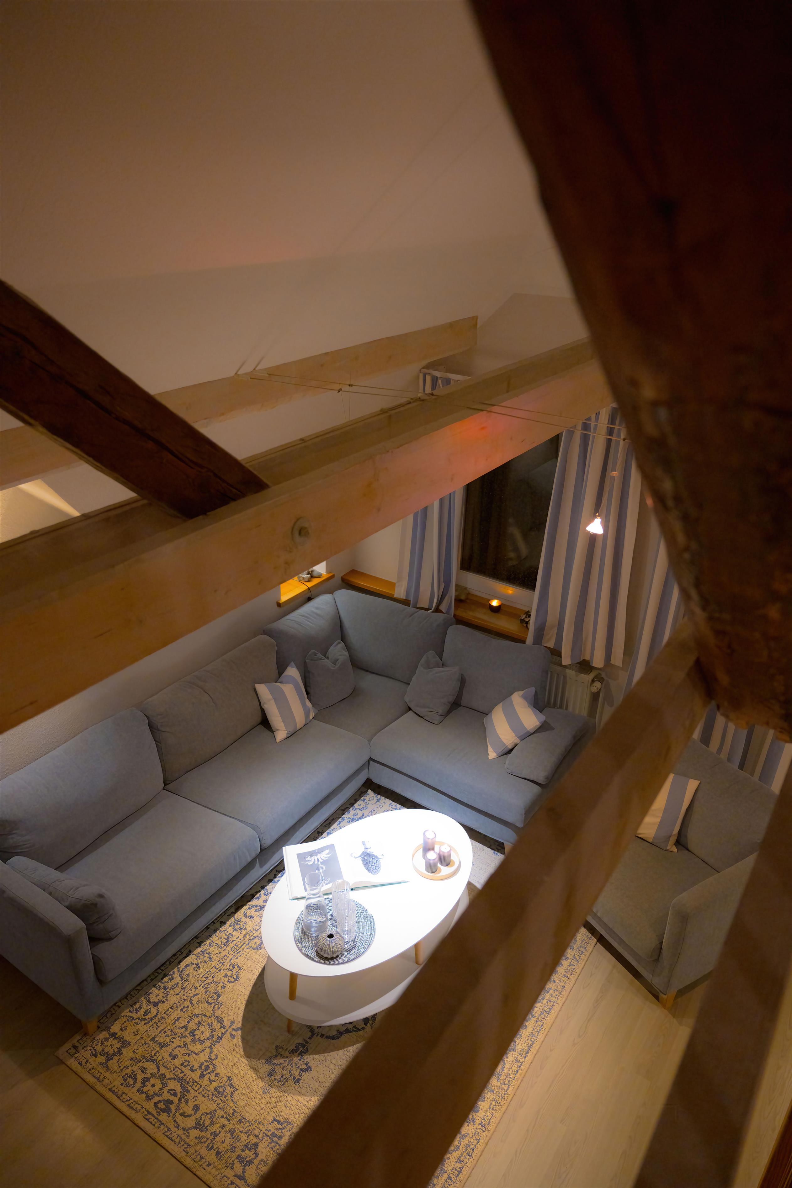 Diese komfortable Ferienwohnung - mit sonnigem Südbalkon und Blick auf die Apfelbäume und den Schafgarten - liegt in der ersten Etage des Bauernhauses auf einem 21ha großen Hof- und Gartengrundstück. Der Kaminofen im großzügigen Wohn-/Essraum mit Sofa garantiert gemütliche Abende. Freuen Sie sich über viel Platz für die ganze Familie: eine Küchenzeile (mit Spülmaschine und Mikrowelle), eine Schlafgalerie, zwei zusätzliche Schlafzimmer, ein Duschbad sowie ein separates WC.