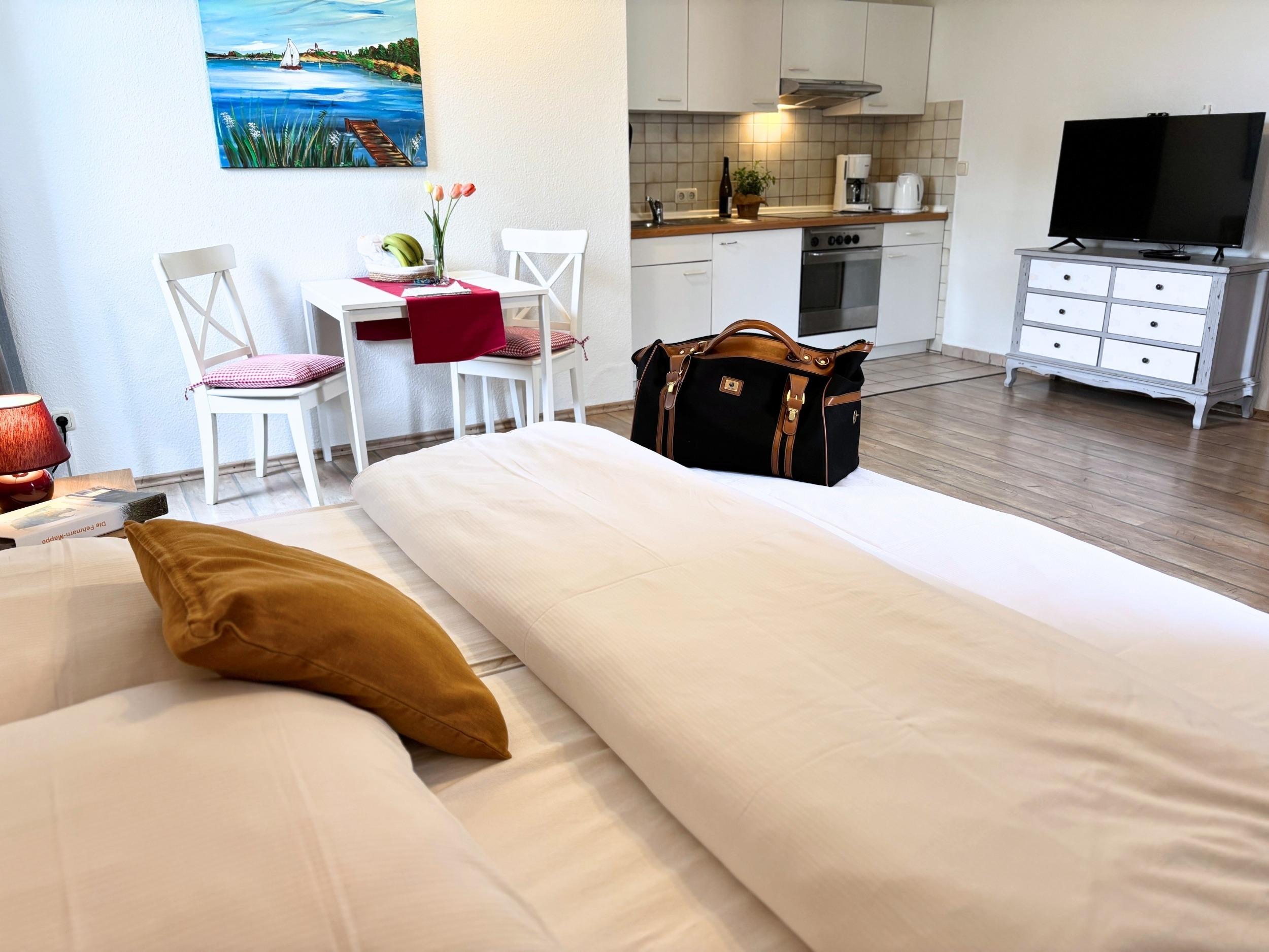 Unsere Fru Hansen ist ein charmantes 1-Raum-Apartement mit Küchenzeile und Duschbad. Es bietet Platz für zwei Personen. Auf Anfrage können wir einen Durchgang zur Ferienwohnung Lieselotte Strandklamotte ermöglichen.