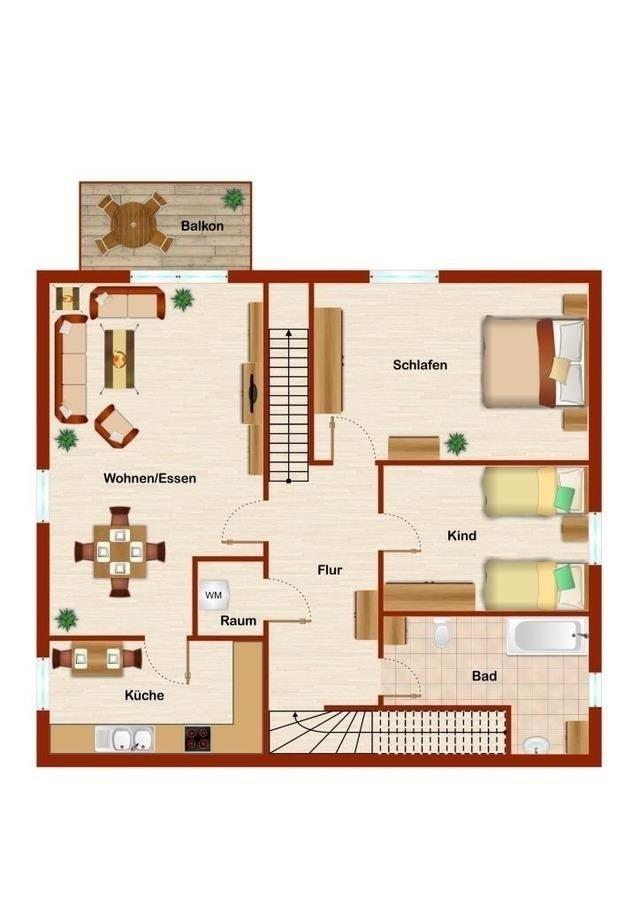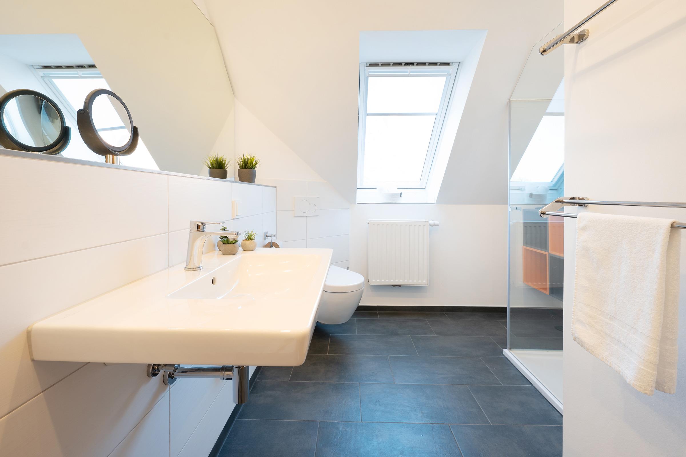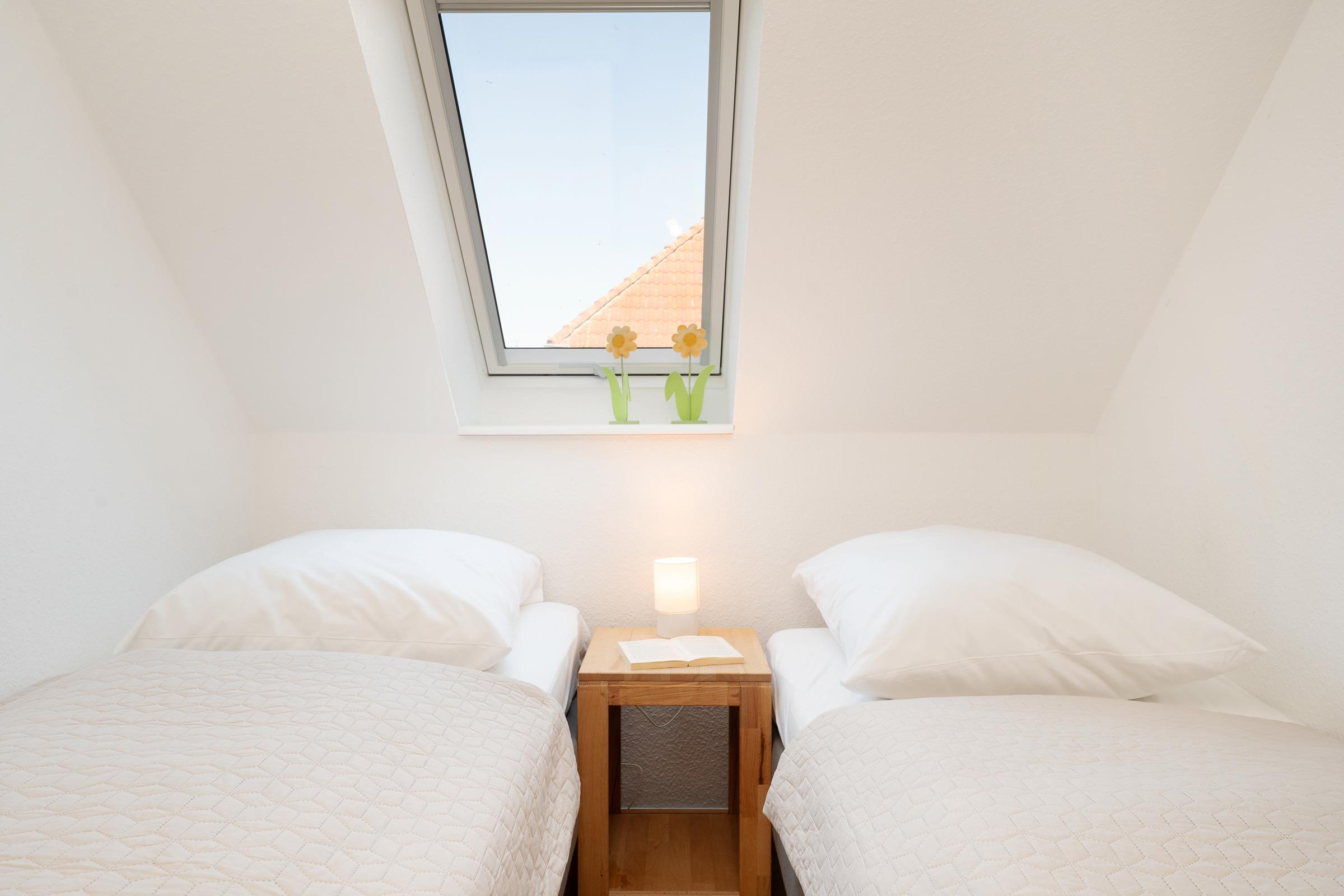 Die charmante Maisonettewohnung punktet mit einem hellen Wohn- und Essraum mit bequemer Polstergarnitur, TV-Gerät, Essecke sowie Zugang zum möblierten Balkon. Die separate Küche ist mit allen Annehmlichkeiten, wie z. B. Spülmaschine, Herd, Backofen und Mikrowelle ausgestattet. Im großen Schlafzimmer befinden sich ein Doppelbett (2x 80x200 cm, offenes Fußteil) sowie ein Kleiderschrank. Im zweiten Schlafzimmer stehen zwei Einzelbetten (je 90x200 cm) und ebenfalls ein Kleiderschrank. Das Badezimmer mit Fenster erwartet Sie mit Dusche, WC und modernem Waschtisch.