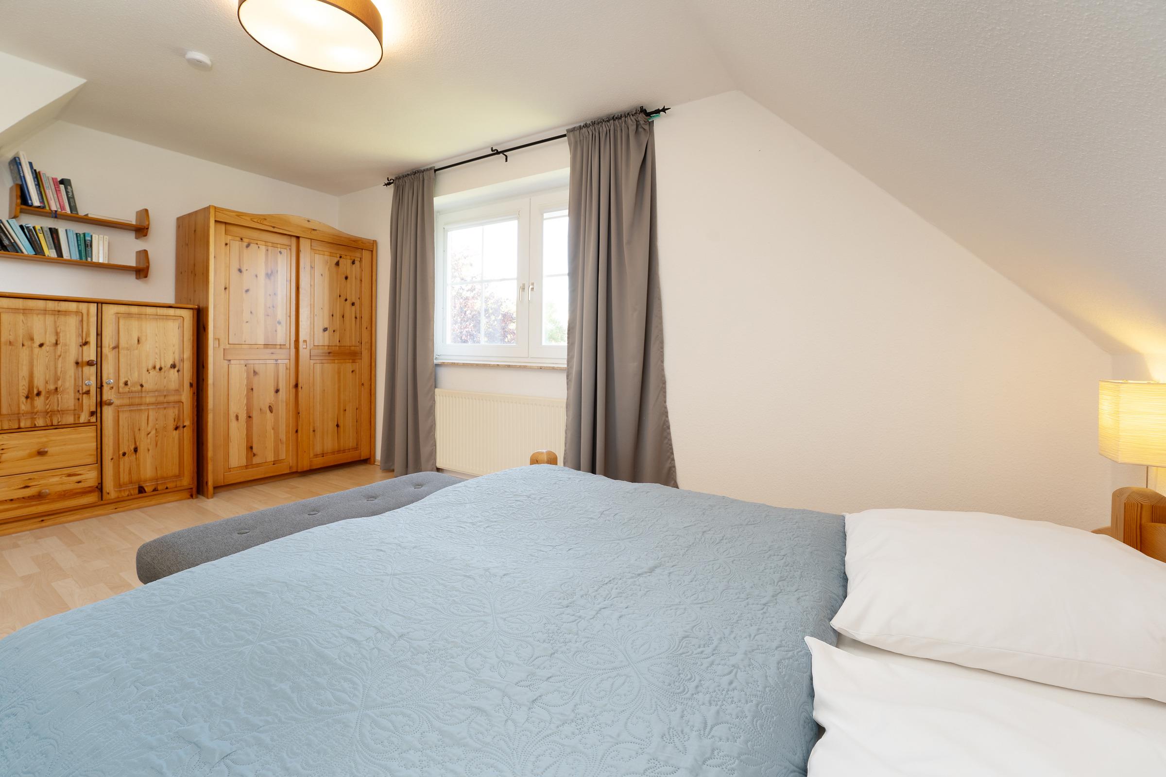 Schlafzimmer 1: Doppelbett (ca. 2x 80x200 cm), Kleiderschrank, Verdunkelung (Vorhang, Jalousie), Platz für Kinderreisebett vorhanden