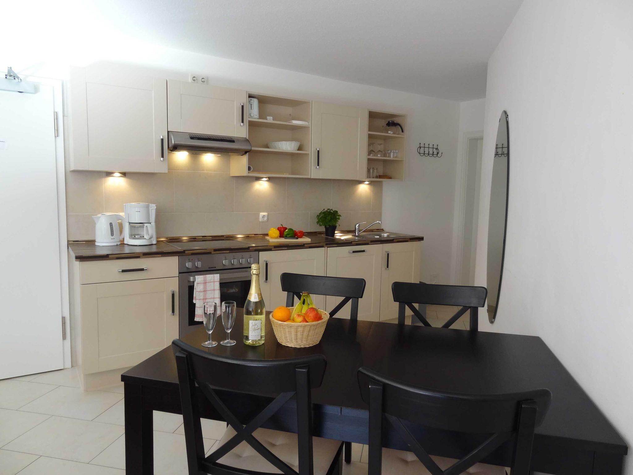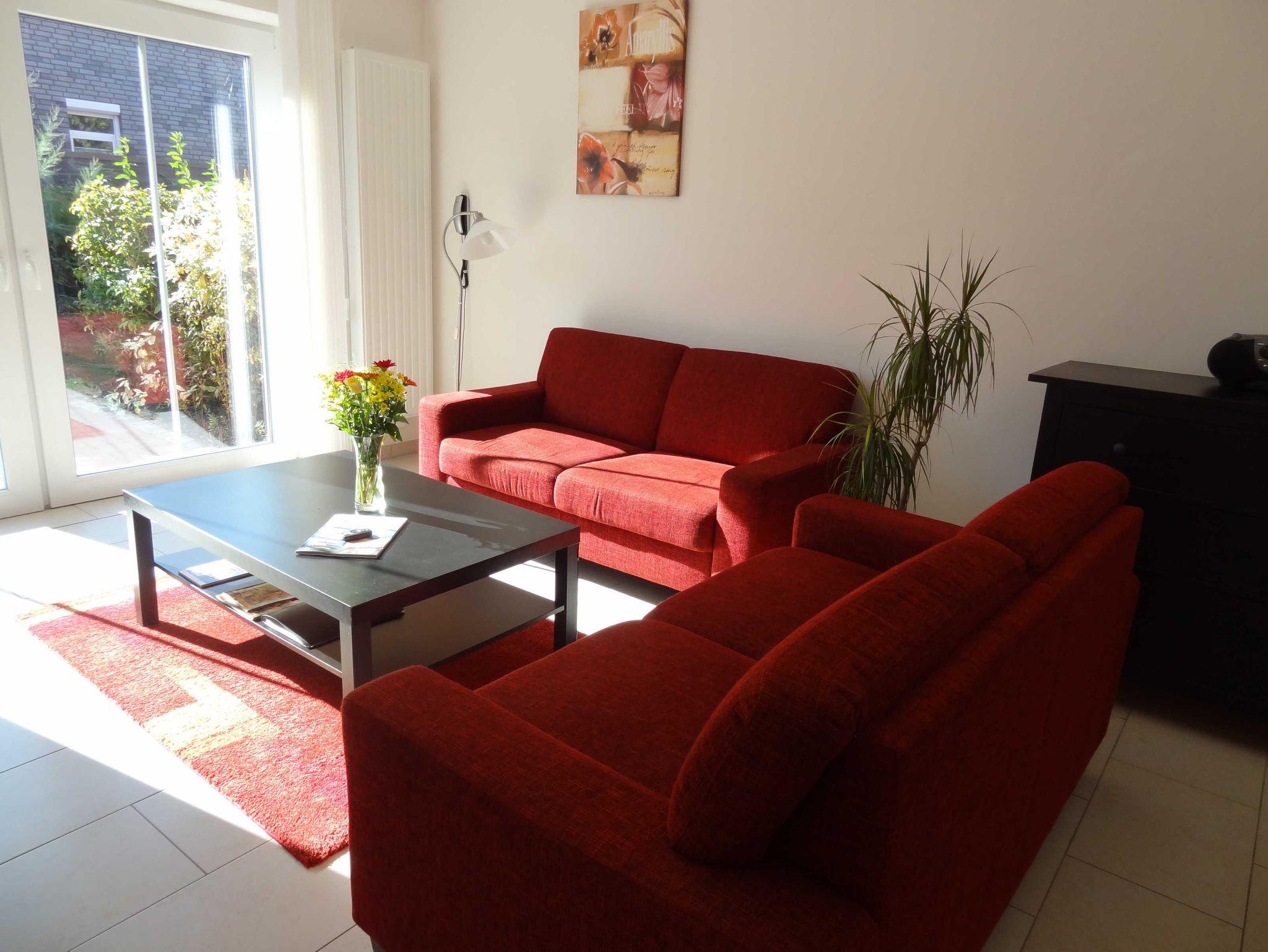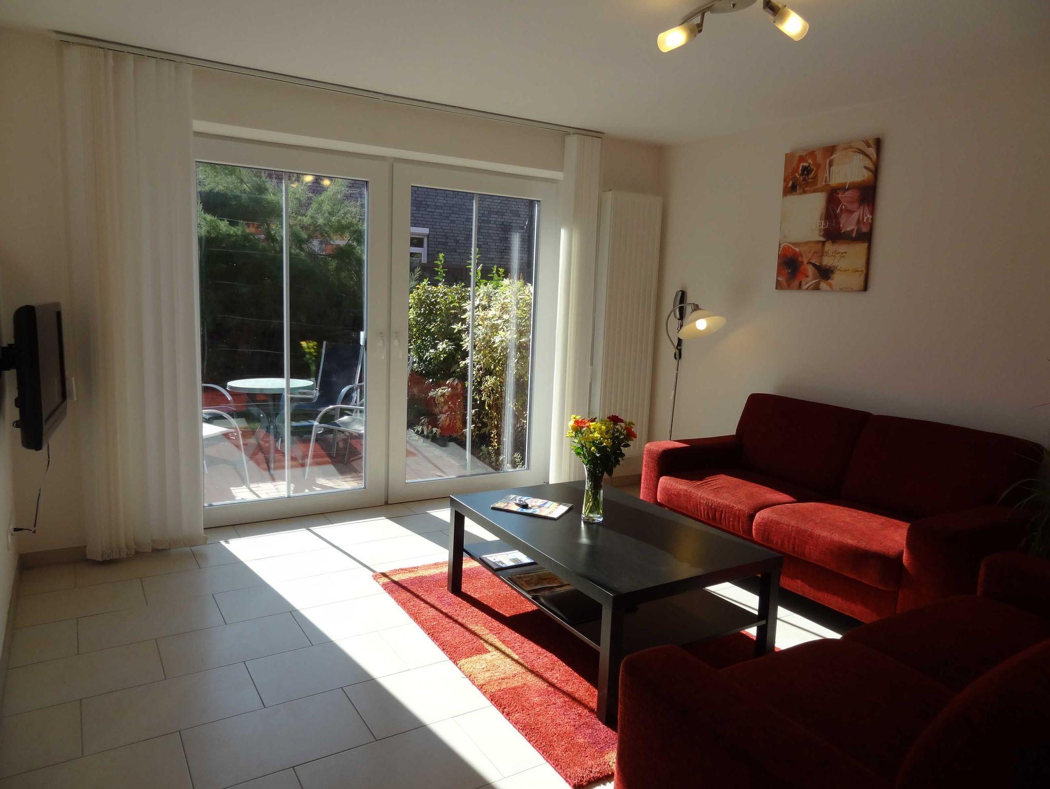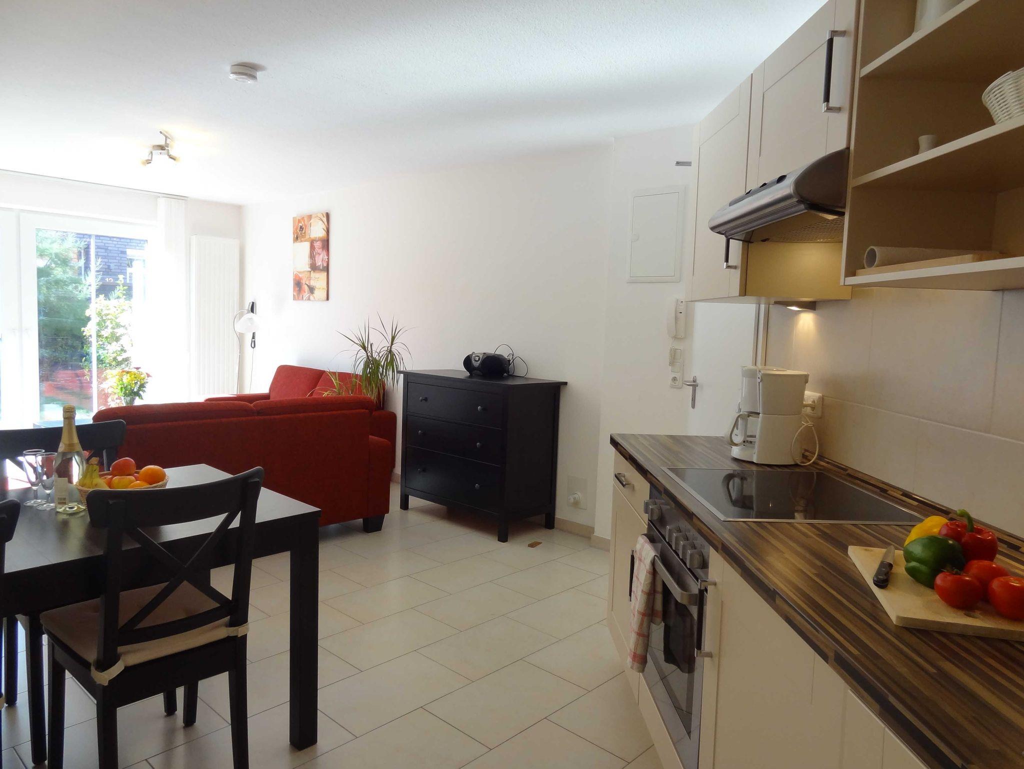 Die Ferienwohnung im Erdgeschoß ist mit ca. 56 qm für bis zu 4 Personen ausgelegt und verfügt über einen Wohnraum mit Küchenzeile incl. Spülmaschine, ein Bad mit Dusche und zwei Schlafzimmer. Weitere Ausstattungsmerkmale: Sat-TV, Telefon kostenlos ( deutsches Festnetz außer Sondernummern ), PC-Anschluss DSL kostenlos, PKW-Stellplatz, Fahrradstellplatz, Waschmaschinennutzung, eigene Süd-Terrasse.