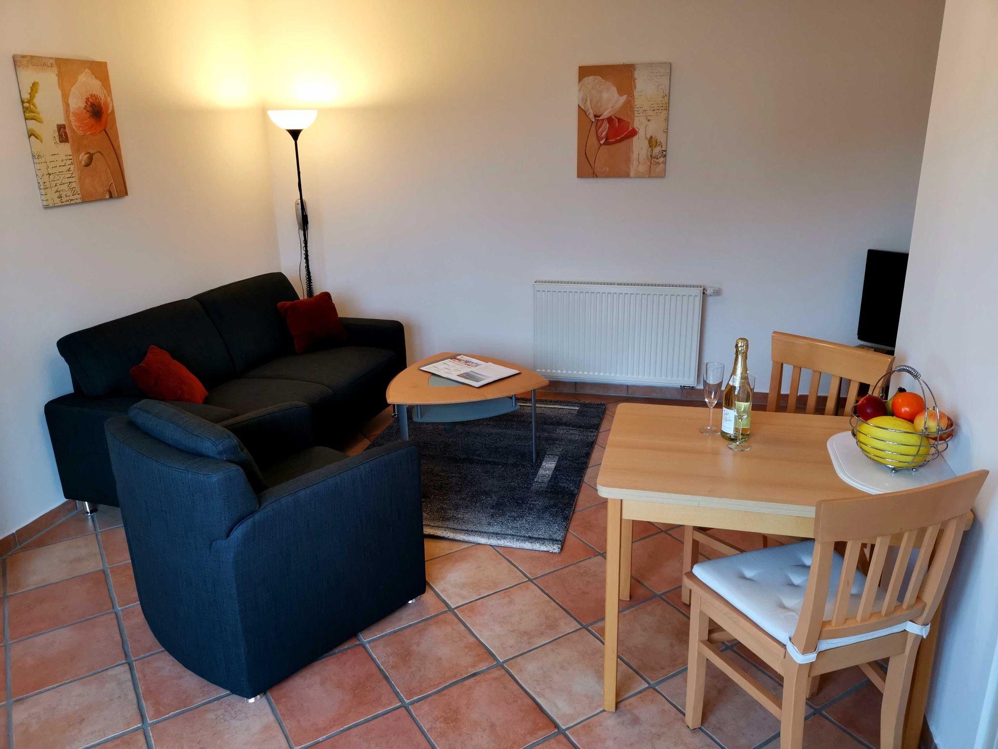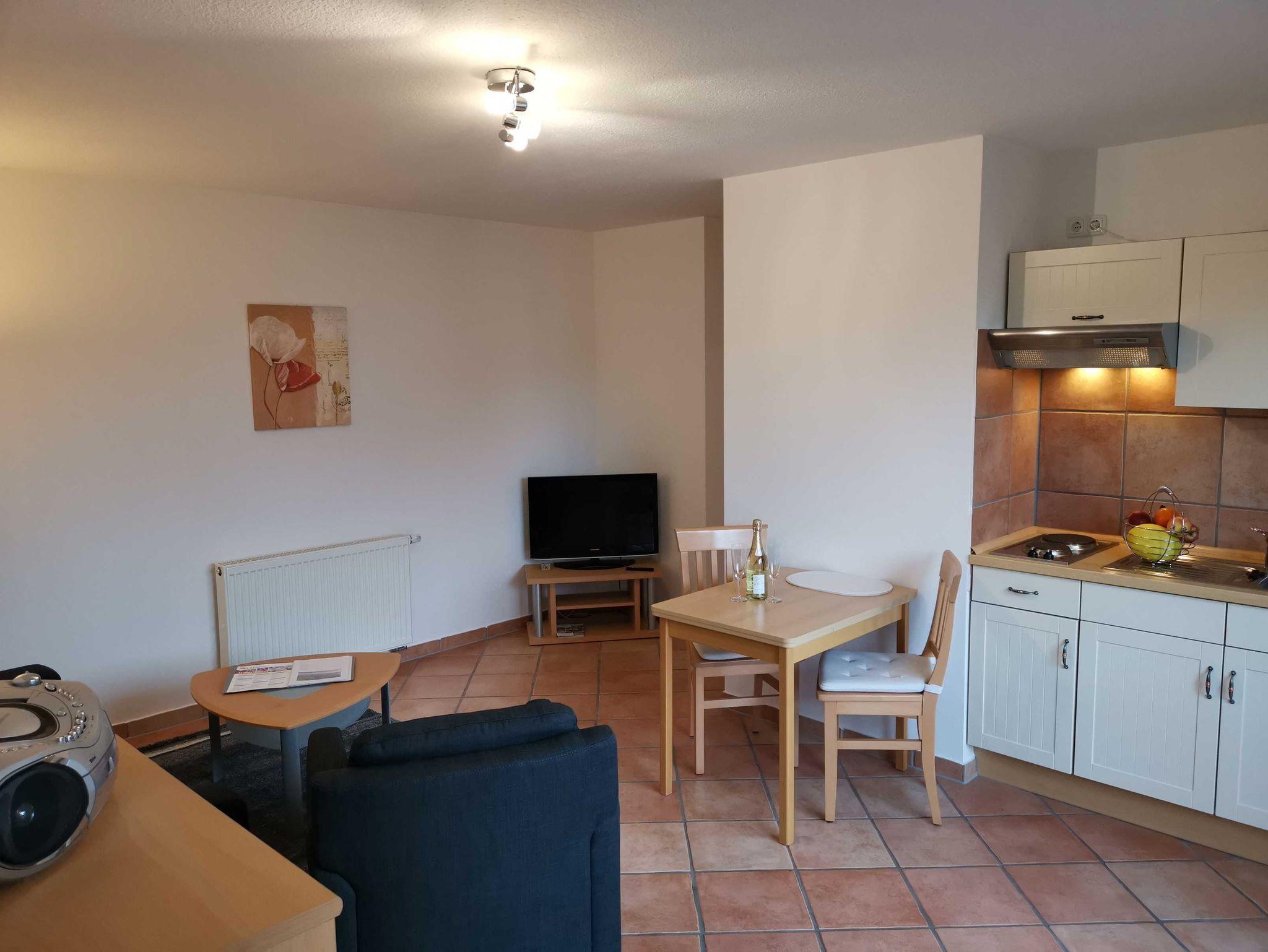 Die Ferienwohnung im Erdgeschoss ist mit ca. 33 qm für 2 Personen ausgelegt und verfügt über einen Wohnraum mit Küchenzeile, ein Bad mit Dusche und ein Schlafzimmer. Weitere Ausstattungsmerkmale: Sat-TV, Telefon kostenlos ( deutsches Festnetz außer Sondernummern ), PC-Anschluss DSL kostenlos, PKW-Stellplatz, Fahrradstellplatz, Waschmaschinennutzung, eigene Terrasse.