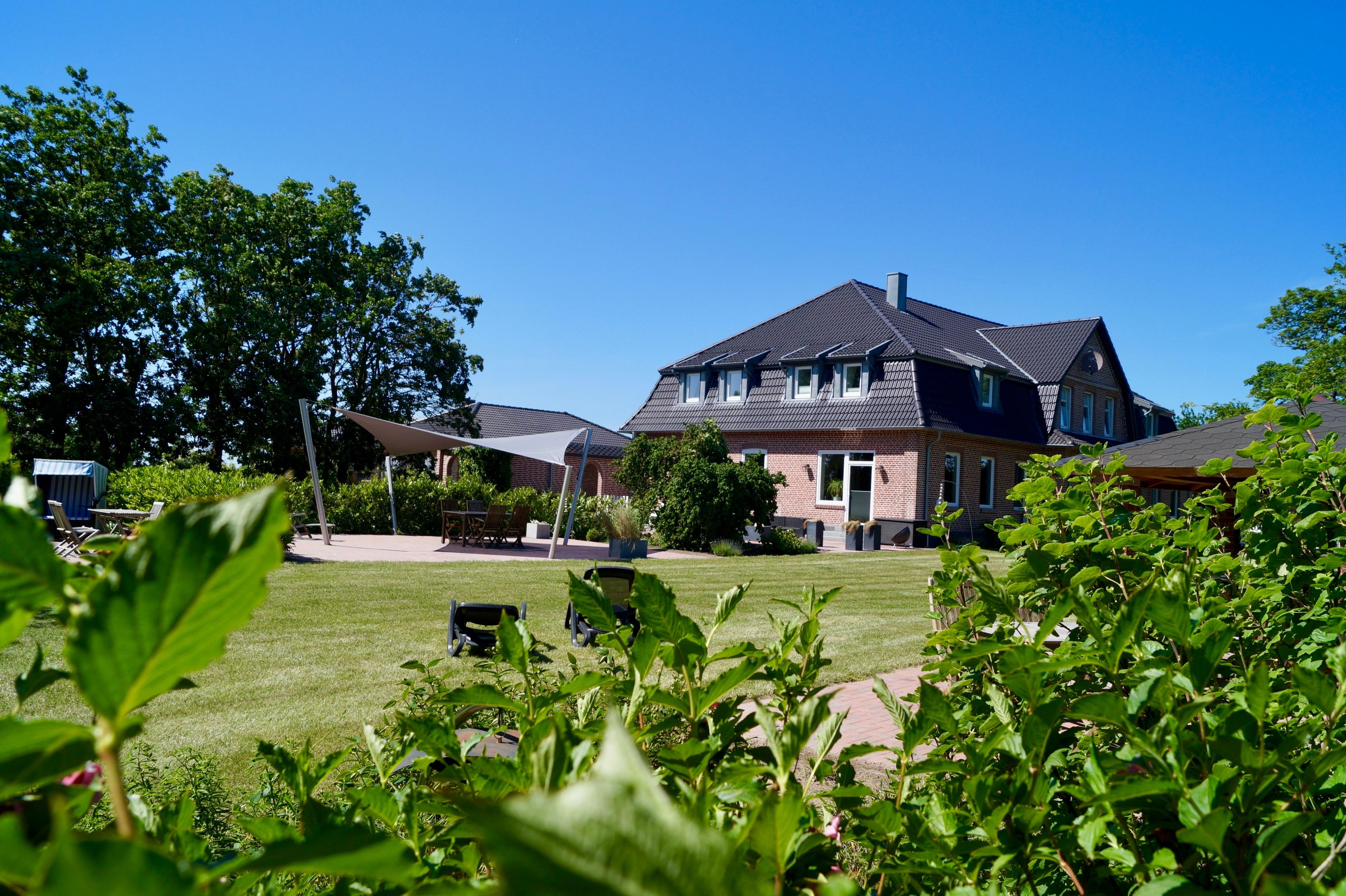 In dem parkähnlichem Bauerngarten gibt es eine Vielzahl von Sitzgelegenheiten und Spielgeräten für die Kinder. Hervorzuheben ist hier, ein Trampolin, ein Spielhaus, eine Schaukel.
