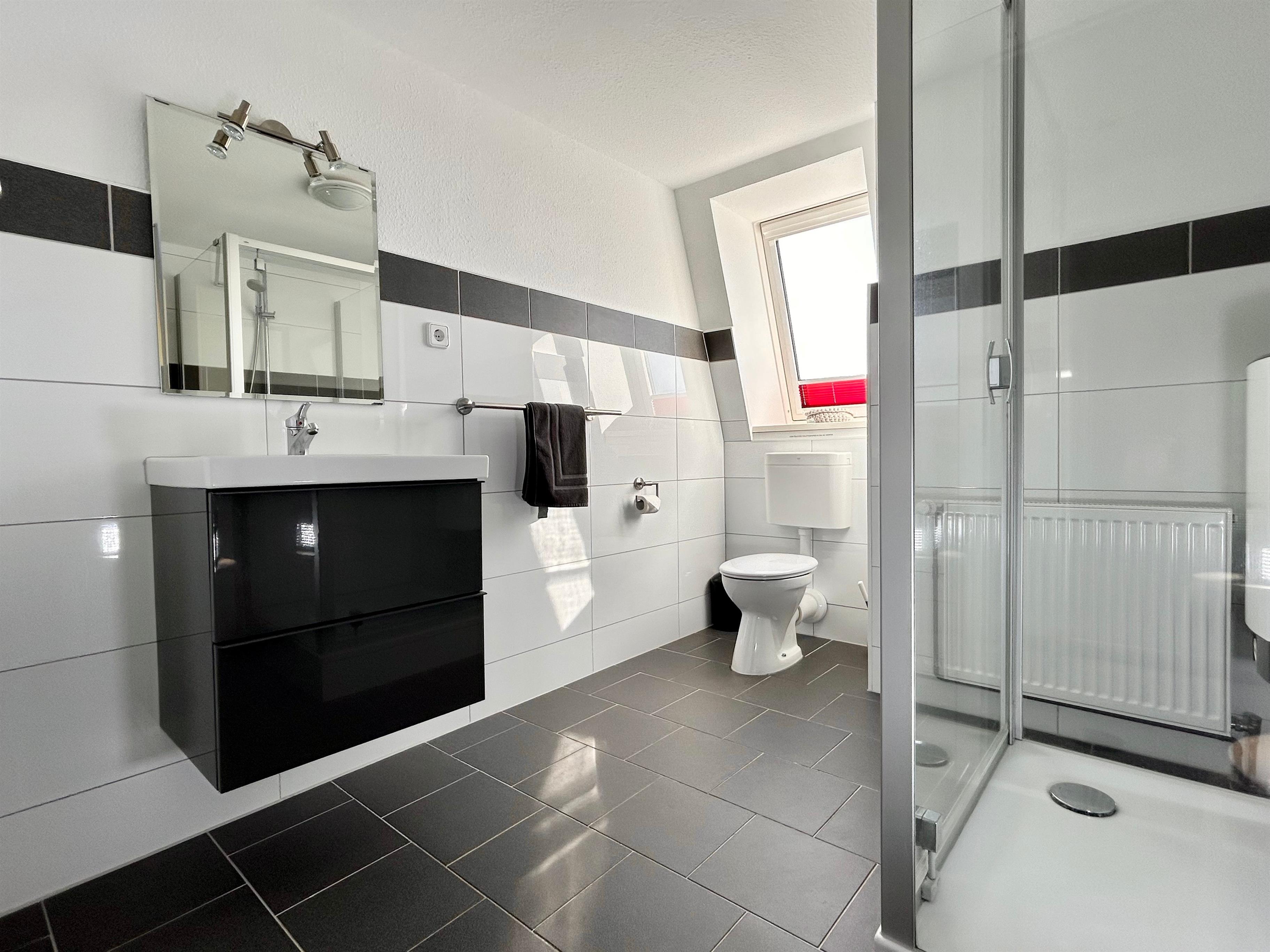 Die Küchenzeile ist voll ausgestattet. Weiter gibt es noch ein Duschbad.