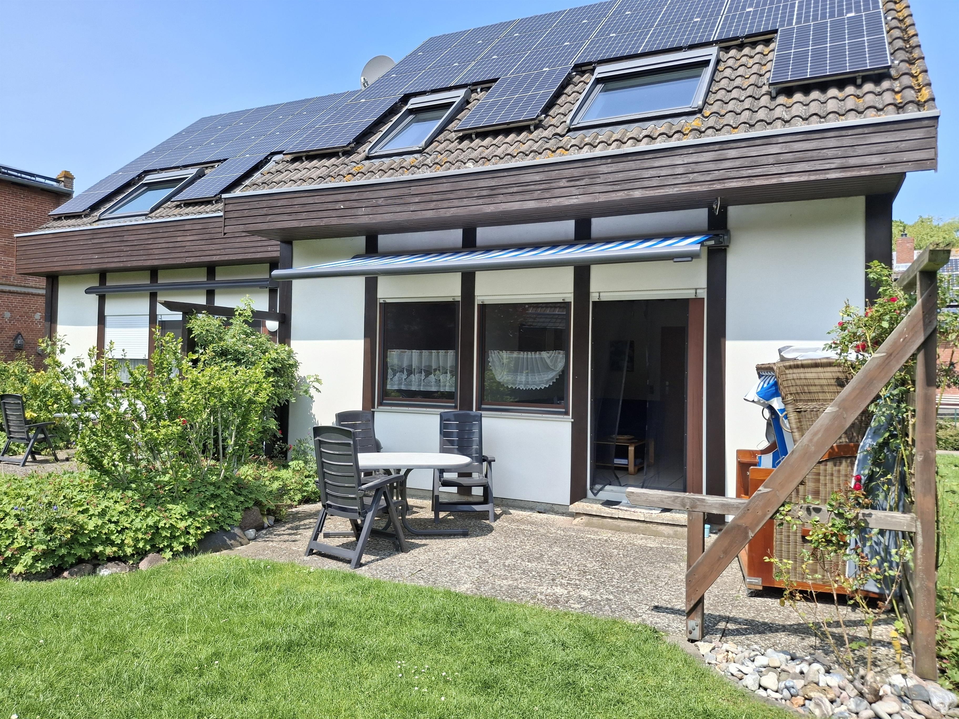 Die Ferienwohnung hat eine Südterrasse mit Markise. Die Terrasse ist ausgestattet mit Strandkorb, Gartenmöebln,Sitzauflagen und Grill.