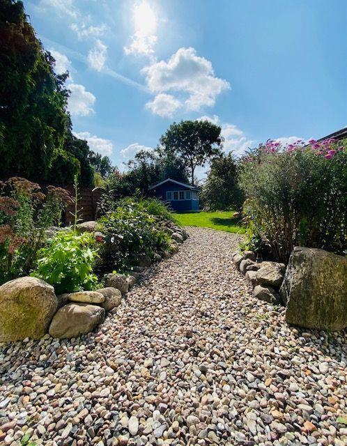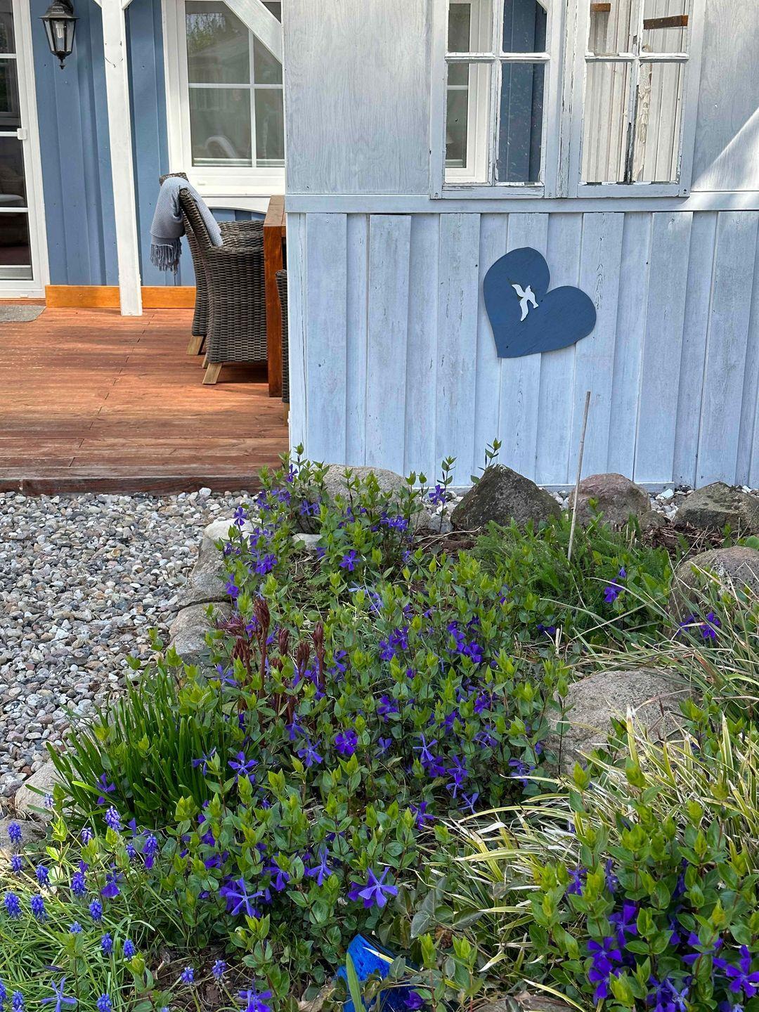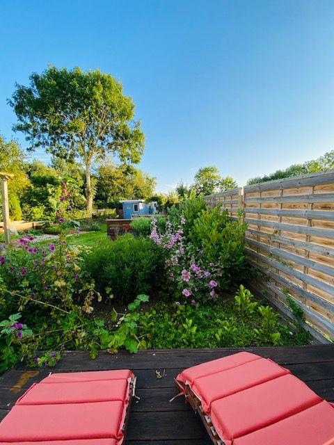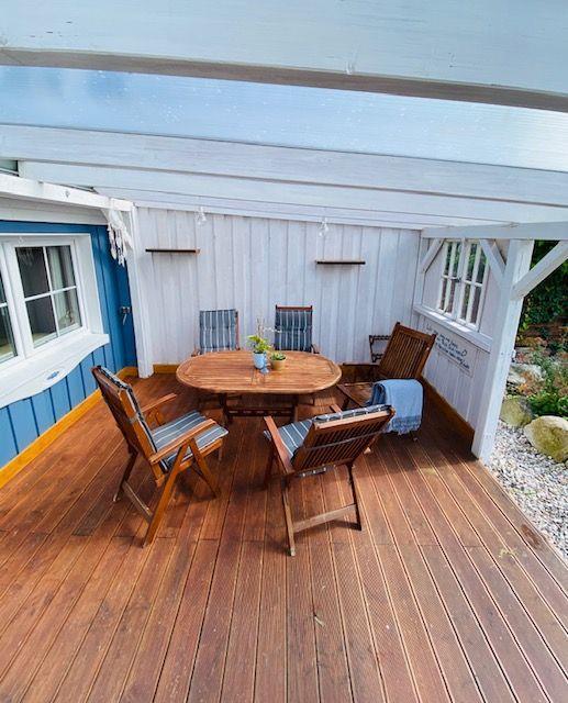 Von der Terrasse aus gelangen Sie in den circa 400 m² großen Garten. Hier finden Sie eine lauschige Sitzecke mit Hollywoodschaukel, Hochbeete mit frischen Kräutern und eine Feuerstelle mit Palettenmöbeln, die zu Abenden mit Stockbrot und Seemannsgeschichten einlädt. Auf einer weiteren Holzterrasse stehen zwei Liegen für Sie bereit, um den Akku im Angesicht des historischen Backhaus wieder voll aufzuladen (Das Backhaus ist jedoch nur den Eigentümern zugänglich).