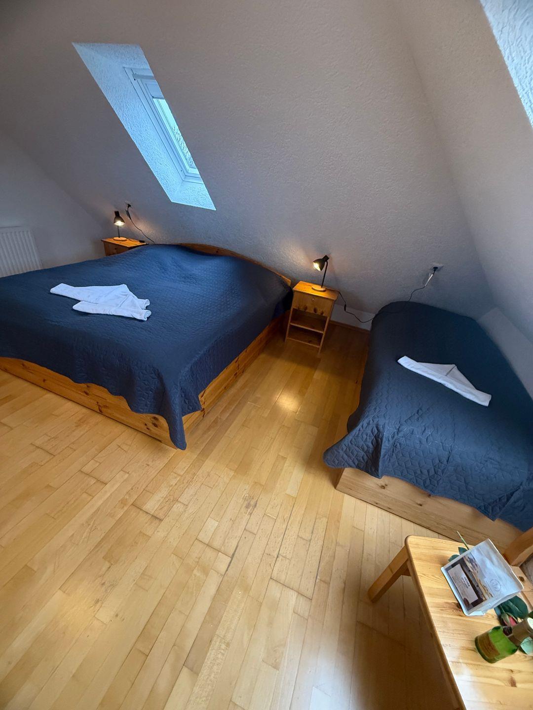 1 Schlafzimmer mit Doppelbett und Einzelbett sowie TV im Dachgeschoss