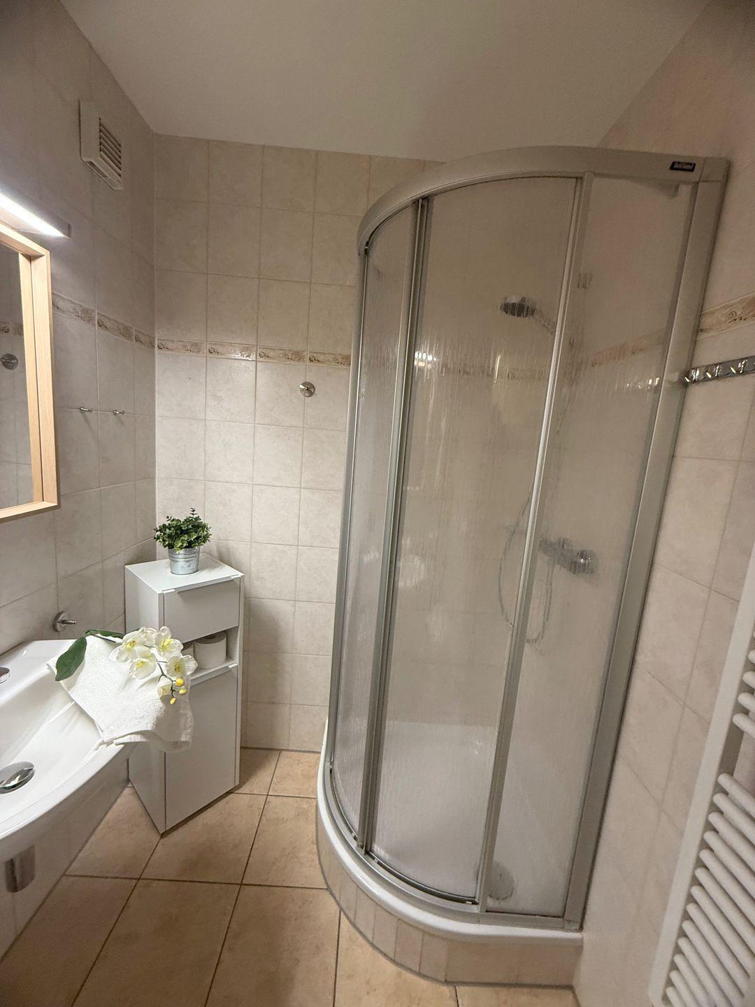 Waschbecken, Spiegelschrank, Dusche, WC, gute Beleuchtung,