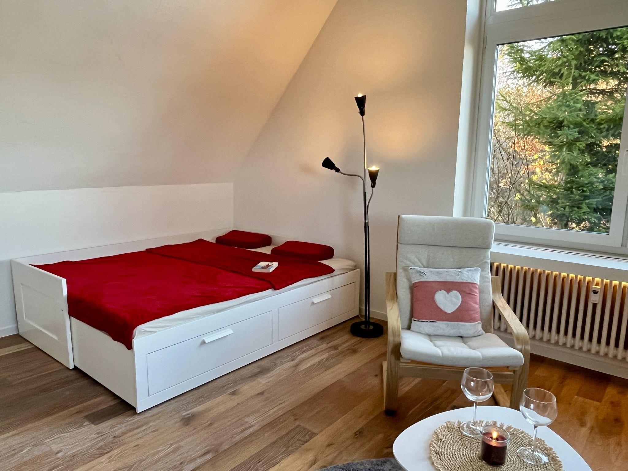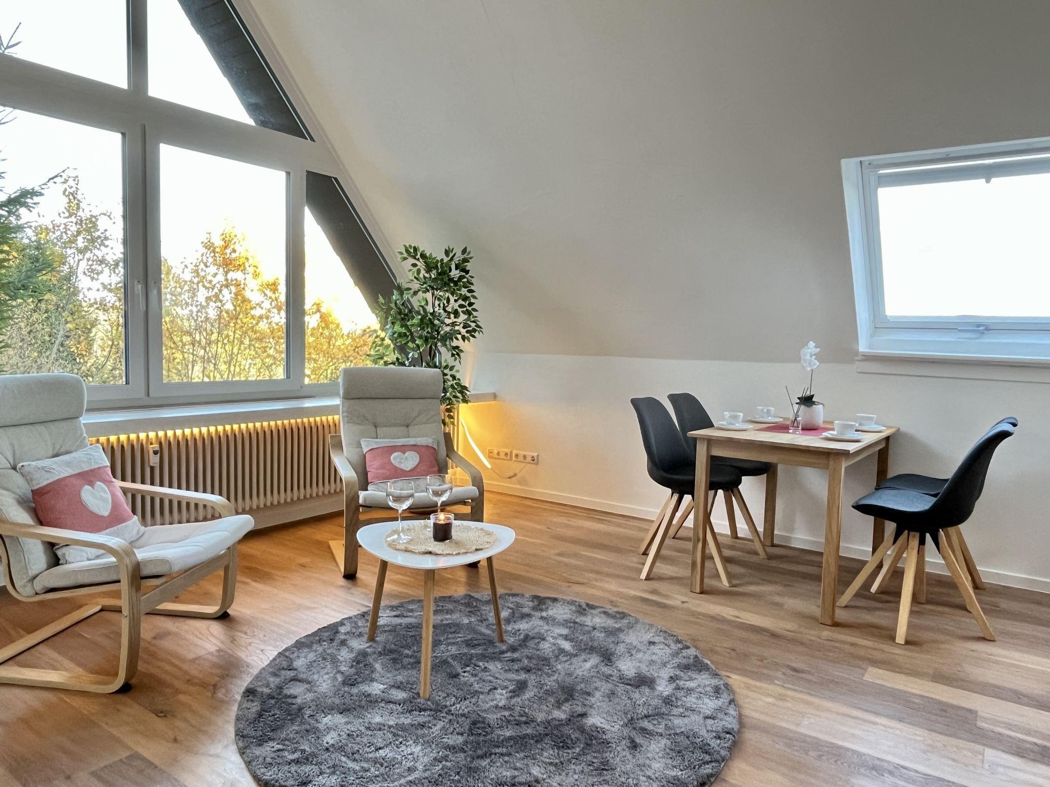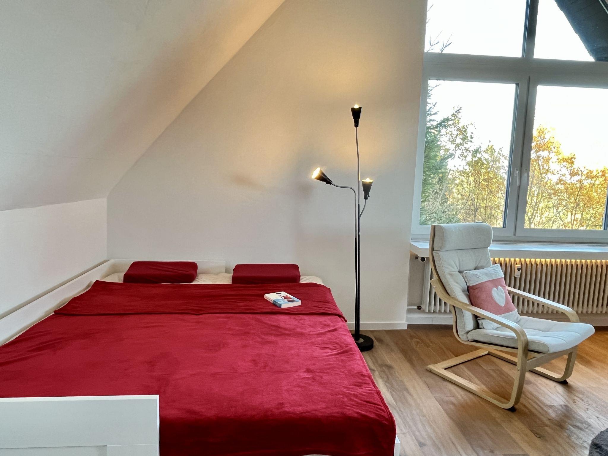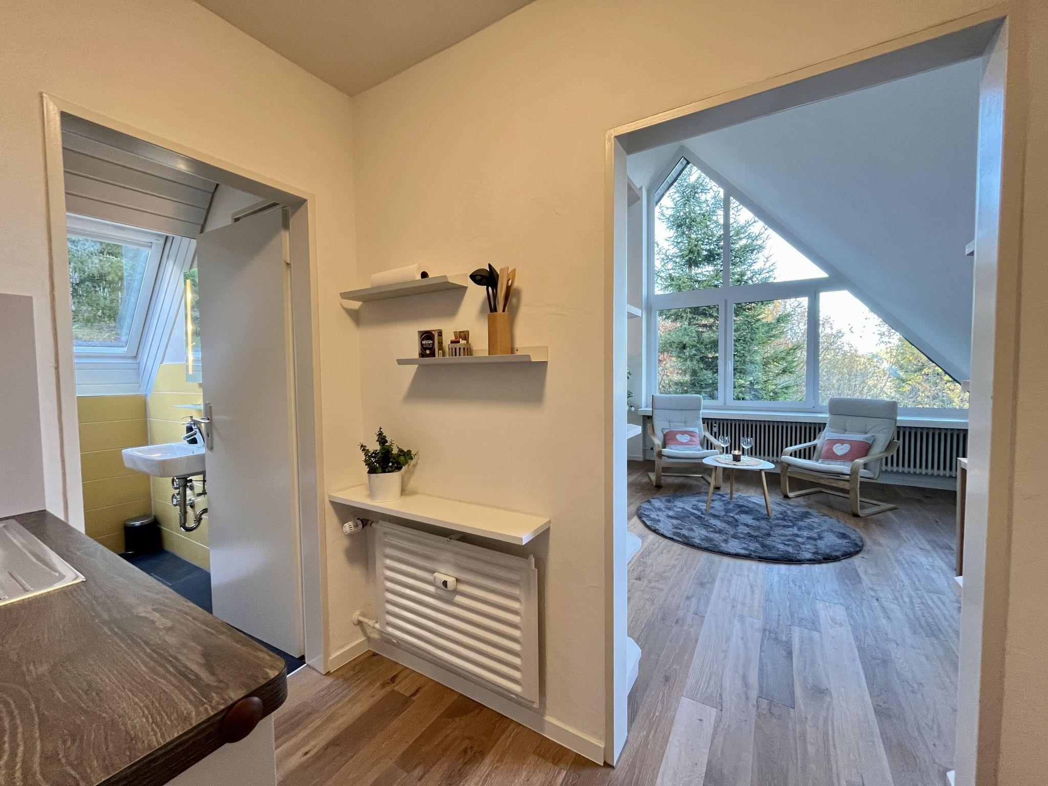 "Falkennest - mit Blick auf den Titisee", 2-room apartment 45 m2 on 2 levels, on the top floor. Bright, partly with sloping ceilings, beautiful and cosy furnishings: large living/sleeping room with 1 double sofabed (2 x 90 cm, length 200 cm), dining table. Small kitchenette in the entrance (1 induction hot plates, toaster, kettle, electric coffee machine). Shower/WC. Heating. Top floor: (steep stair), 1 large room with sloping ceilings with 2 beds (90 cm, length 200 cm). Sep. WC. Heating. Wooden floors. Marvellous view of the mountains and the valley. Facilities: children's high chair, baby cot for up to 2 year olds, hair dryer. Internet (WiFi, free). Parking at the house. Please note: not suitable for small children one double bedroom is outside the apartment. Non-smokers only. Smoke alarm, fire extinguisher, no lift. No internal connecting door between the floors. Please note that the large living/bedroom can only be moderately darkened (panoramic window)! When there are less than the maximum number of guests staying at the property, not all of the bedrooms will be available for use. When there are less than the maximum number of guests staying at the property, one floor will not be available for use.
