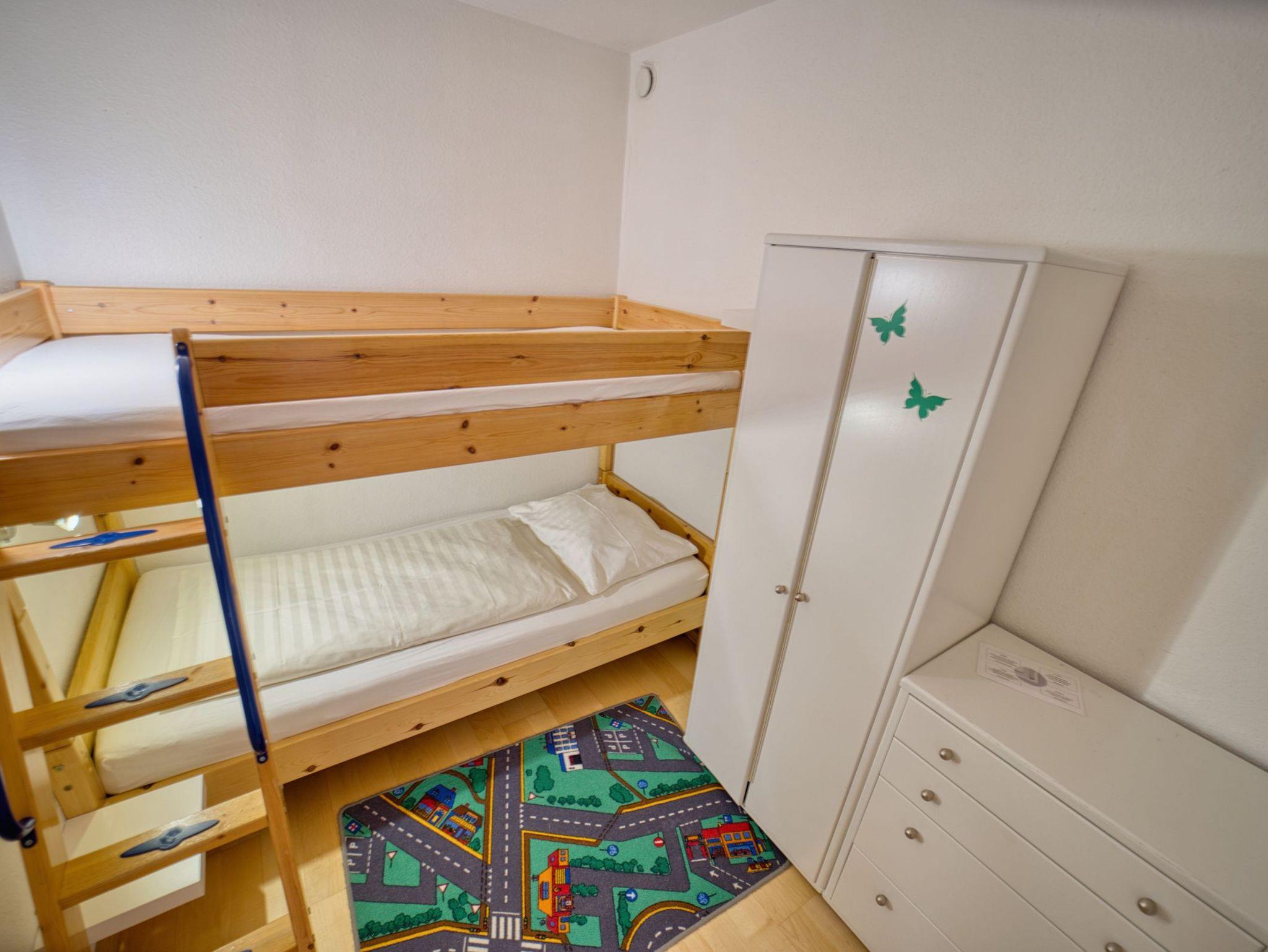 Diese Ferienwohnung befindet sich im Erdgeschoss eines Appartementhauses und bietet Platz für maximal 2 Erwachsene und 2 Kinder unter 16 Jahre. Im Kinderzimmer, abgetrennt durch eine Tür, befindet sich ein Etagenbett.