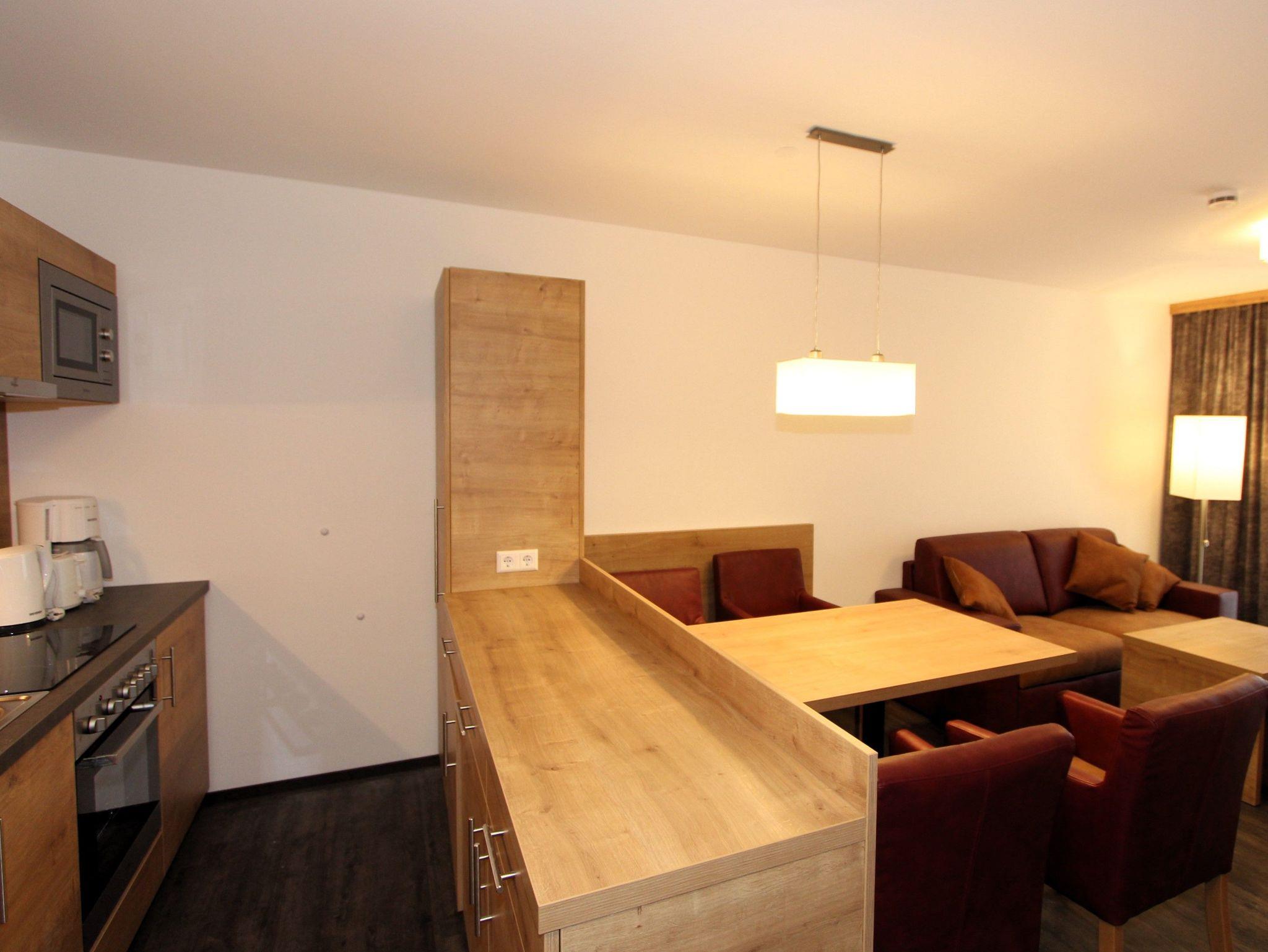 Das Appartement verfügt auf 47 m² über einen Wohnraum mit moderner, voll ausgestatteter Küchenzeile, Essplatz und Sitzecke, deren Couch sich unkompliziert in eine Schlafgelegenheit für zwei Personen umbauen lässt. Sowohl im Wohnraum als auch im Schlafzimmer mit Doppelbett gibt es ein SAT-TV-Gerät. Im modernen Bad mit der bodengleichen Dusche und der Whirlpoolwanne können Sie nach einem langen Tag auf Skiern oder einer ausgiebigen Wanderung wunderbar entspannen.