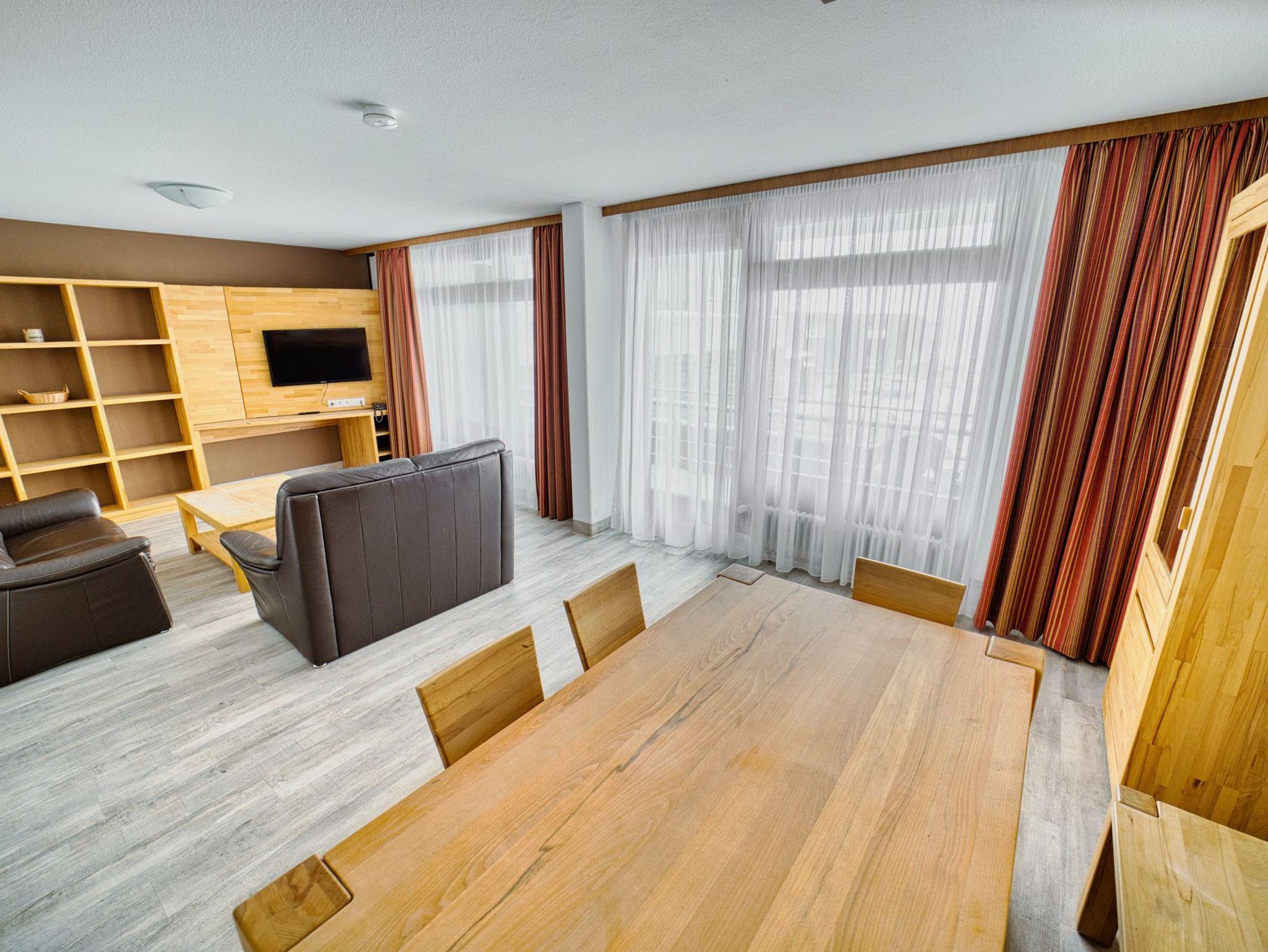 Das Gebäude ist mit einem geschlossenen Übergang mit dem Hotel Feldberger Hof verbunden. Von den Ferienwohnungen kann trockenen Fußes die Tiefgarage und der Skikeller erreicht werden.