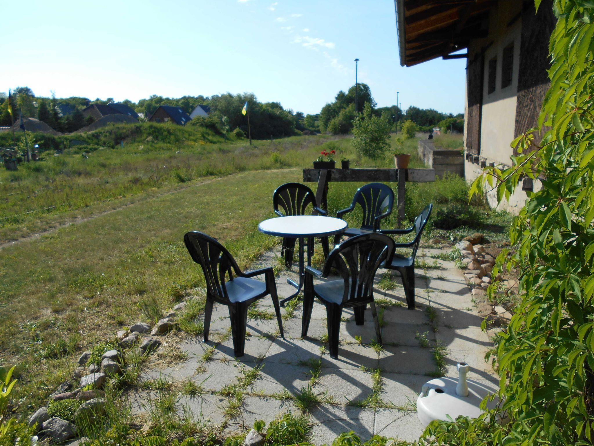 Bahnsteig als Terrasse nutzbar. Gartenmöbel werden gestellt.
