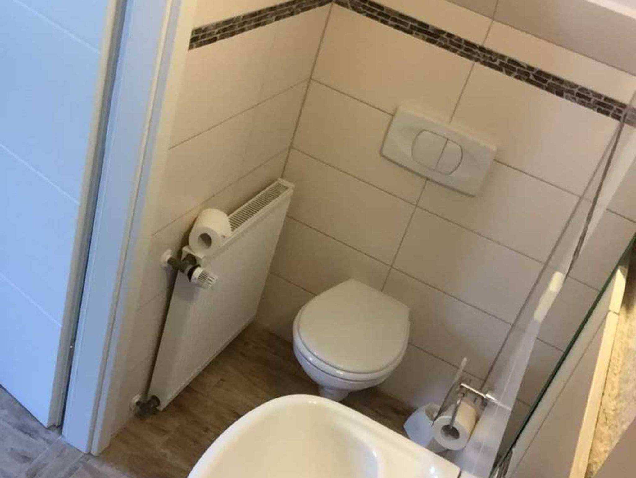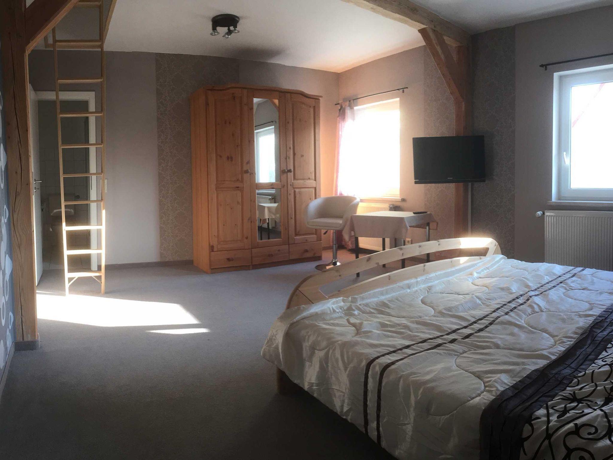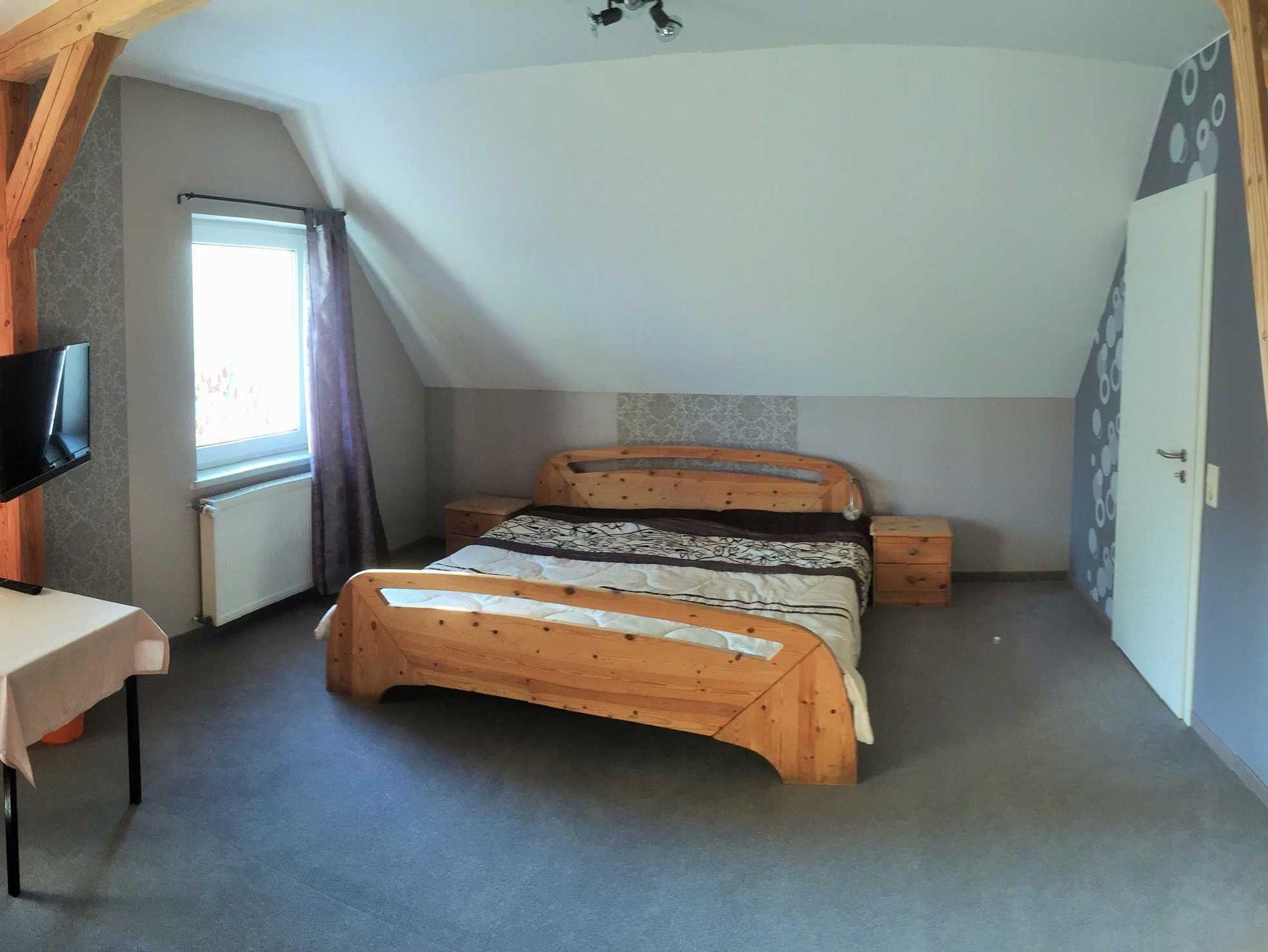 Die Ferienwohnung bietet insgesamt für maximal 8 Personen Schlafmöglichkeiten. In jedem der beiden Doppelzimmer wurde der Spitzboden mit einer Schlafnische (ab 12 Jahre gedacht) ausgestattet, welche über eine Leiter erreichbar ist. Somit ist pro Zimmer ein Doppelbett und zwei Aufbettungen im Spitzboden für insgesamt je 4 Personen geeignet. Die Küchenzeile (Kühlschrank mit Gefrierfach, Mikrowelle, 2 Herdplatten) liegt in der goldenen Mitte zwischen den zwei Doppelzimmern. Die eine hälfte der Wohnung hat ein kleines eigenes Bad mit Dusche und WC. Die andere hälfte ist mit Dusche, WC und freistehender Badewanne ausgestattet.