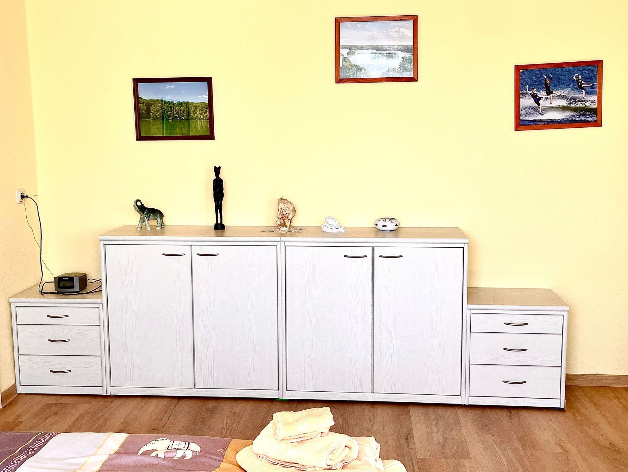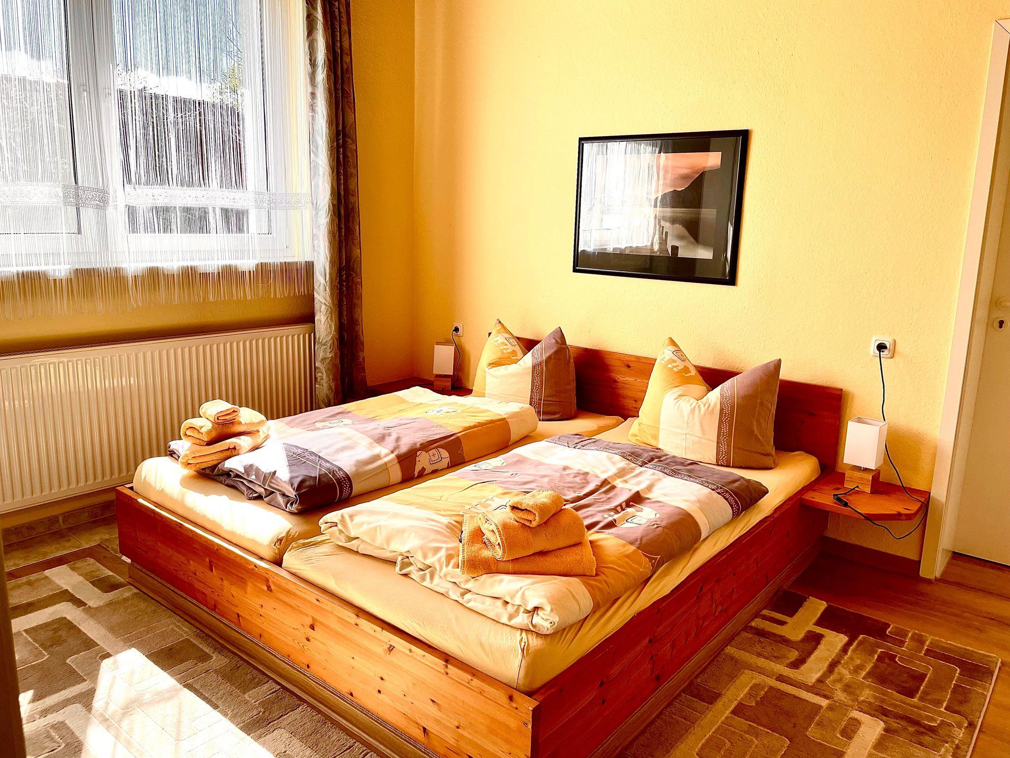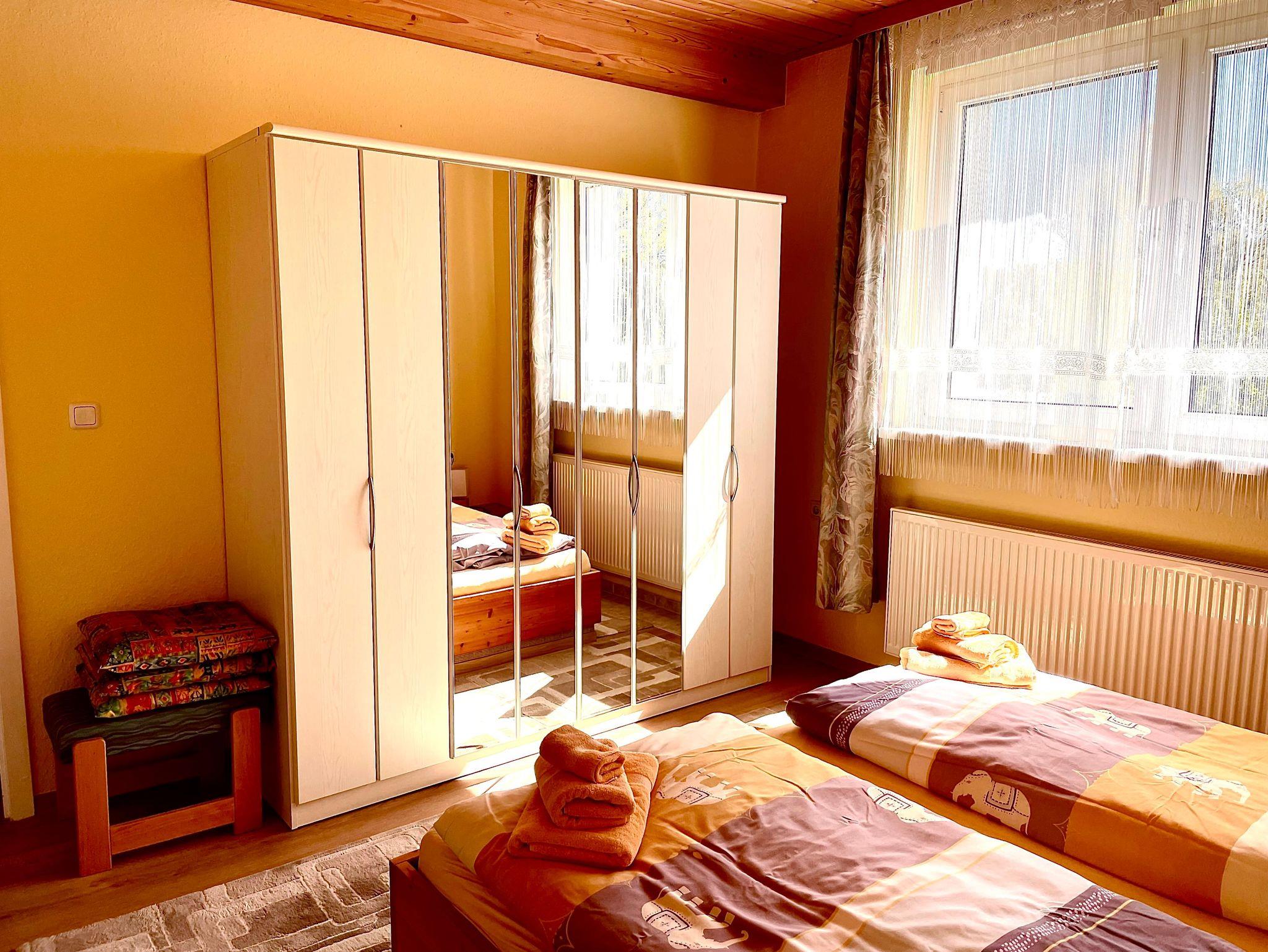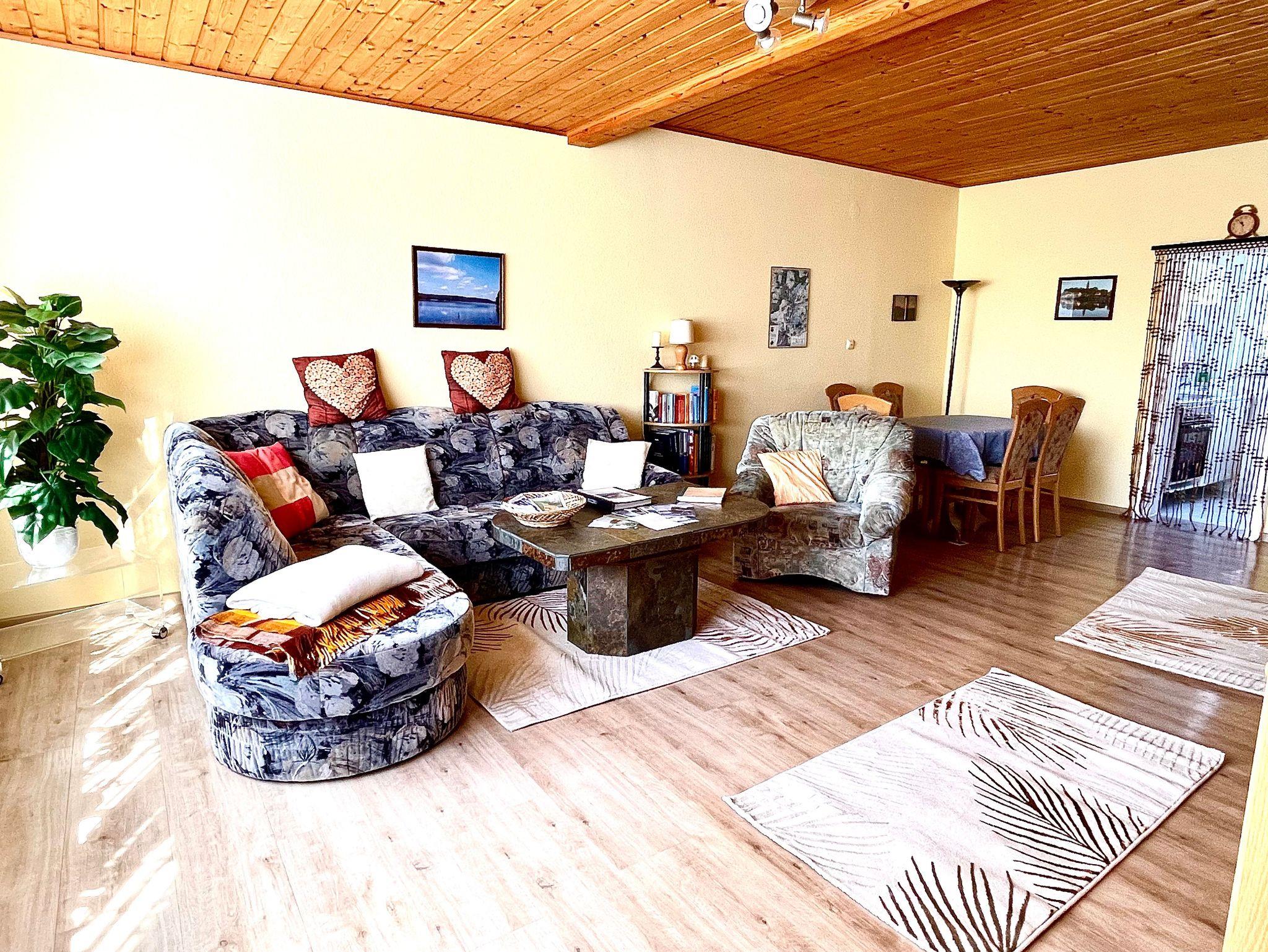Wir bieten Ihnen unsere 80 qm große Ferienwohnung mit 2 Schlafzimmern und einem großen Wohnzimmer mit gemütlicher Sitzecke, separatem Essbereich und Ausziehcouch. Für die ganz kleinen Gäste bis zu 3 Jahren haben wir ein extra Kinderbett. Es ist genügend Platz, Gläser und Geschirr für 6 Personen, so dass Sie mit der ganzen Familie, auch in mehreren Generationen Platz bei uns finden. Aber auch für 2 Personen ist unsere Ferienwohnung ideal, falls Sie getrennte Schlafzimmer bevorzugen.