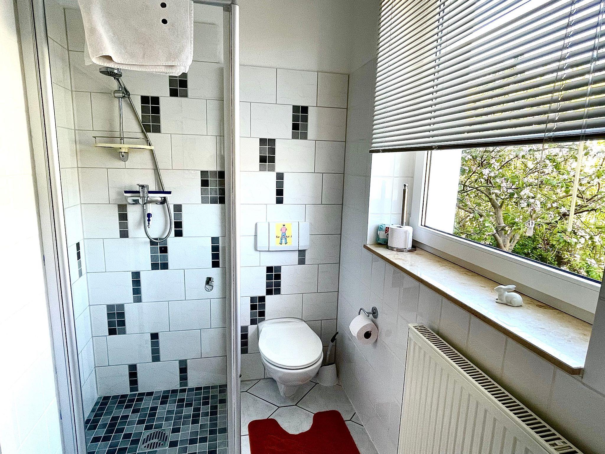 Das Bad ist frisch renoviert mit einer ebenerdigen, modernen Dusche.