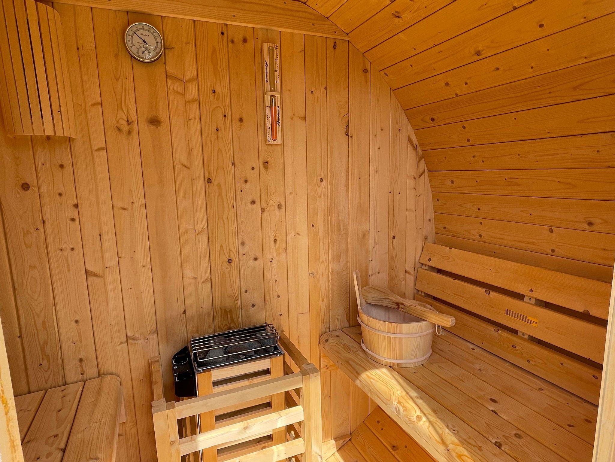 Unsere neuste Errungenschaft ist eine Fass-Sauna für 2 Personen, in der Sie sich von den Wanderungen oder Fahrradtouren erholen können.
