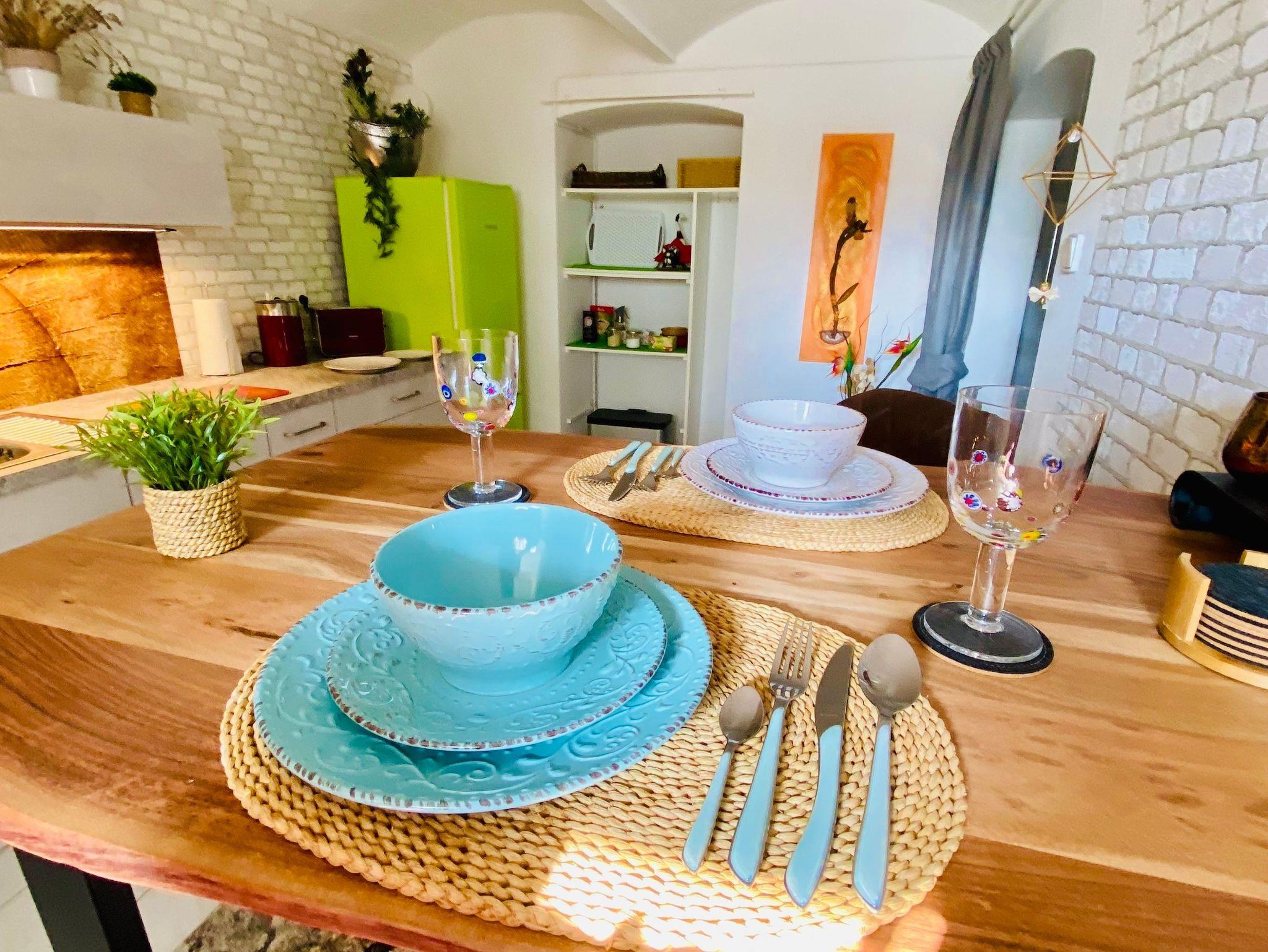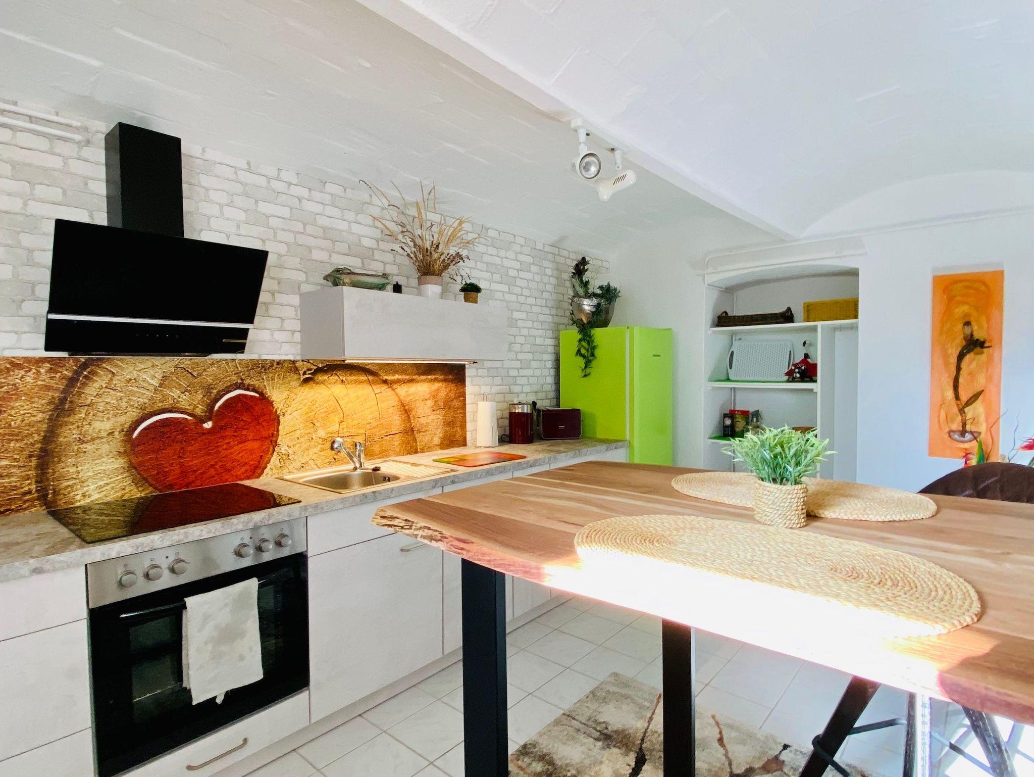Diese Ferienwohnung Frohsinn ist ein Fest für die Sinne und bietet Menschen einen passenden Rahmen, die für mindestens eine Woche Urlaubsflair genießen wollen. Da Küche und Bad sich im Gewölbekeller befinden ist diese Ferienwohnung nicht für Menschen geeignet, die Schwierigkeiten mit Treppen steigen haben.