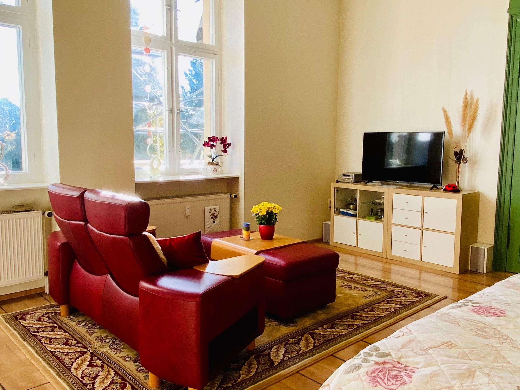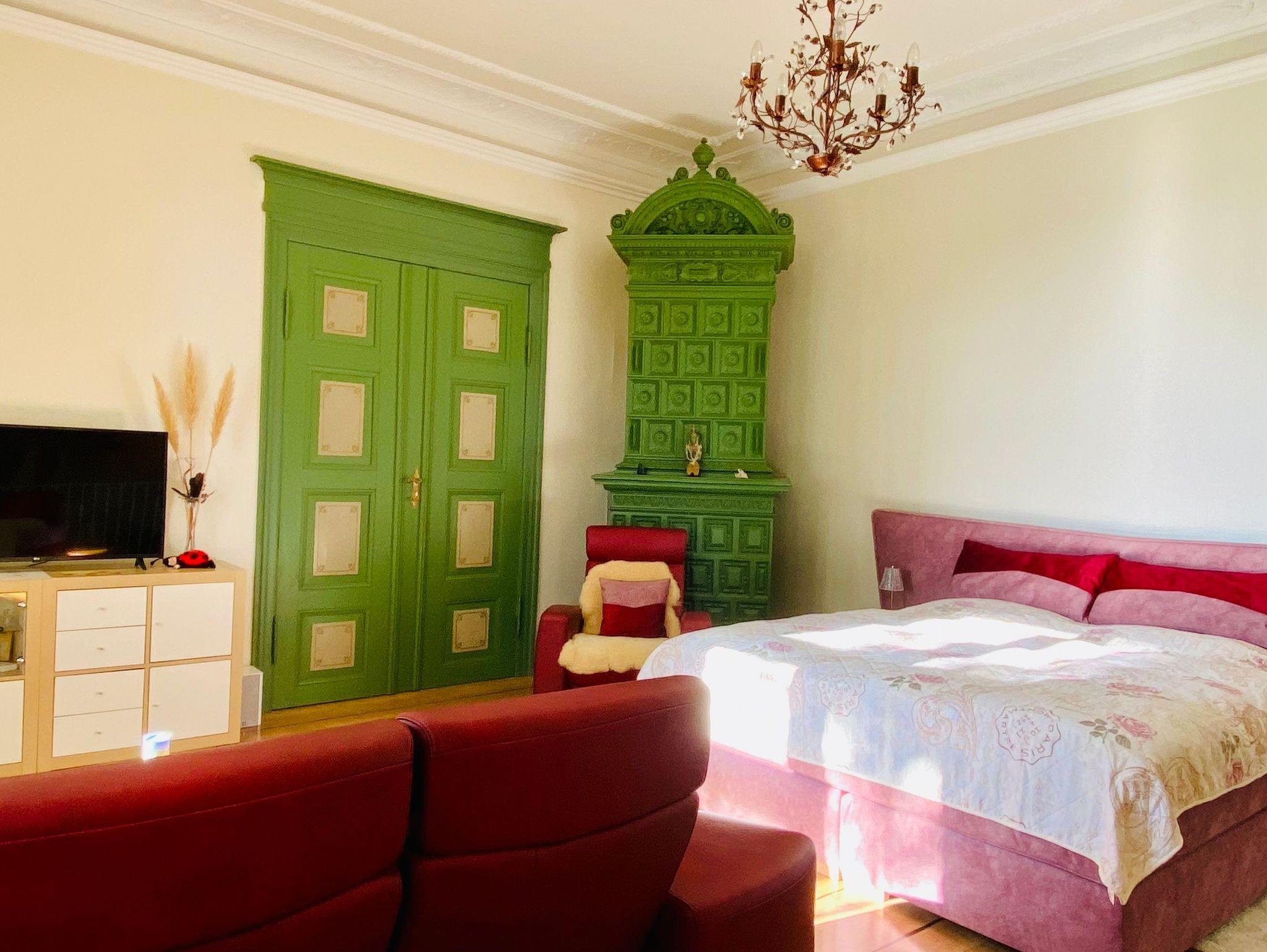 Der herrschaftlich hohe Raum ist mit Originalstuck und dem original gesetzten Kachelofen von 1865 geschmückt. Eine moderne Kinositzgarnitur mit vielen Funktionen ermöglicht entspanntes Sein zum Schmökern, Musik hören, arbeiten und Fernsehen bevor sie im modernen Boxspringmeisterbett erholsam schlafen. Die moderne Einrichtung bildet einen stimmigen Kontrast zu den überlieferten und sehr gut erhaltenen Originalelementen.