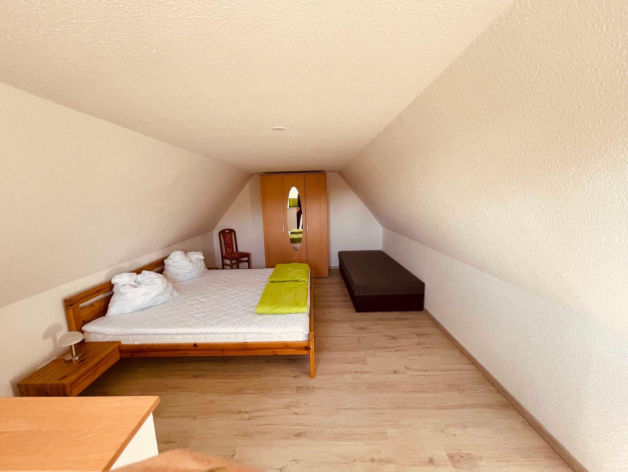 Die Ferienwohnung 2 (Mansardenwohnung) bietet mit seiner Wohnküche und der dazu gehörenden Terrasse einen schönen Blick auf den See. Das im Dachgeschoss gelegene Schlafzimmer ist mit einem Boxspringbett und einem Einzelbett ausgestattet. Im Wohnzimmer befindet sich für weitere Schlafmöglichkeiten ein Schlafsofa.