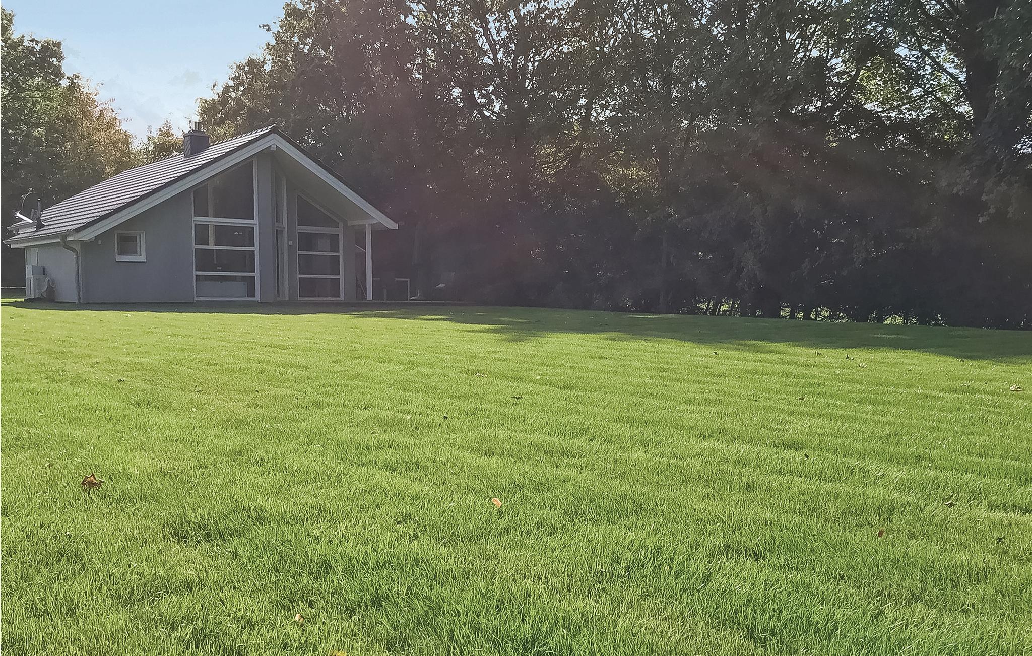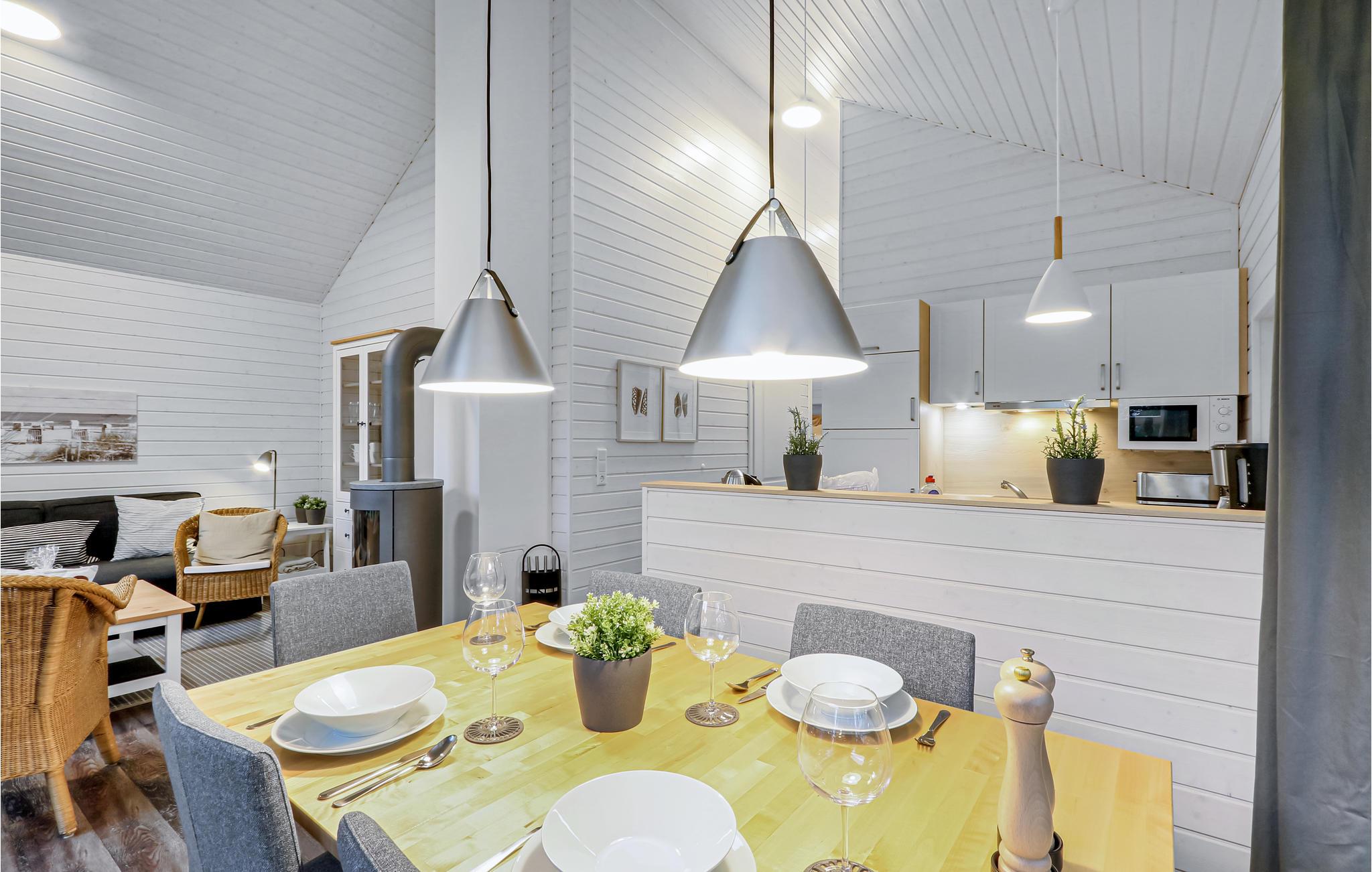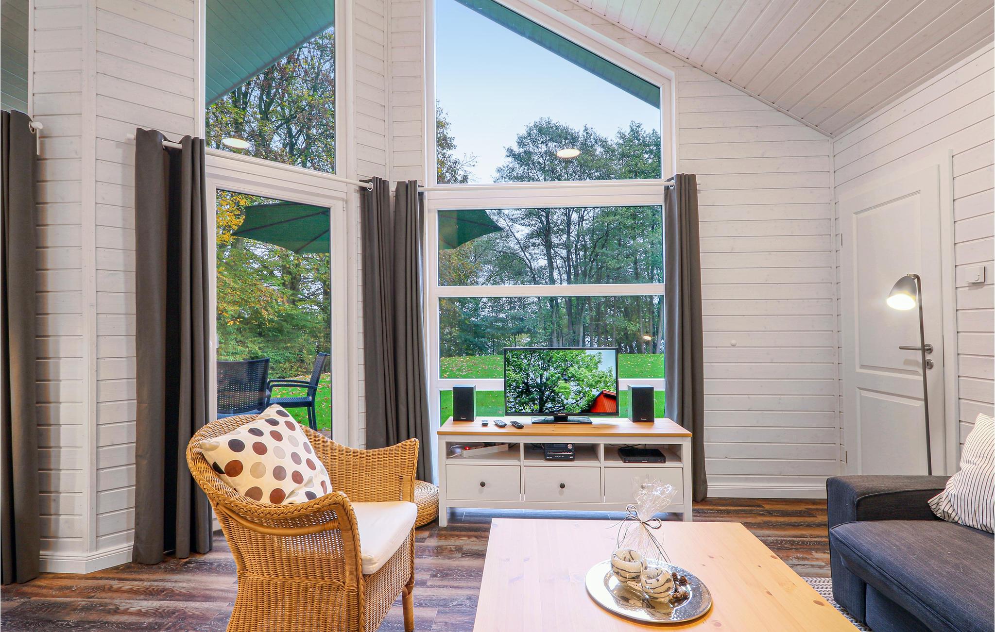 Dette moderne feriehus af træ: 'Waldliebe' giver god plads til fire voksne og to børn. Her er loft til kip og store vinduer, der giver en rummelig og lys atmodsfære. Den maritime indretning i lyse farver bidrager også til den hyggelige stemning.