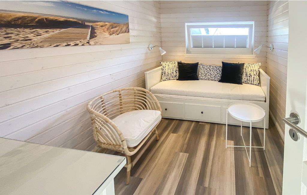 Dette moderne feriehus af træ ligger kun cirka 50 m fra havet. Her er loft til kip og store vinduer, der giver en rummelig og lys atmosfære. Den maritime indretning i lyse farver bidrager også til den hyggelige stemning.