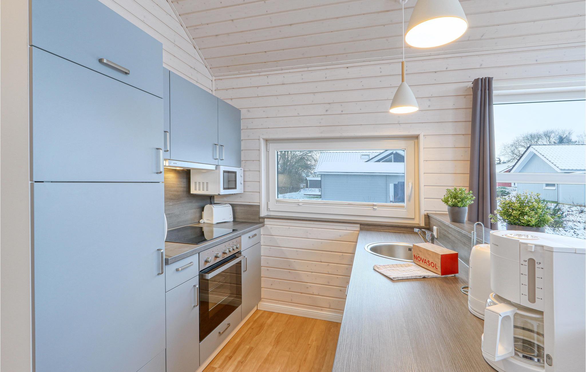 Det første soveværelse har en dobbeltseng, det andet soveværelse har to enkeltsenge. Børnene kan lave deres natlejr på sovesofaen i opholdsstuen. Køkkenet ligger i et separat rum uden dør og er veludstyret. Fryseren har plads nok til at afkøle den friskfangede fisk. Der er dobbelt så meget service og bestik til jer.