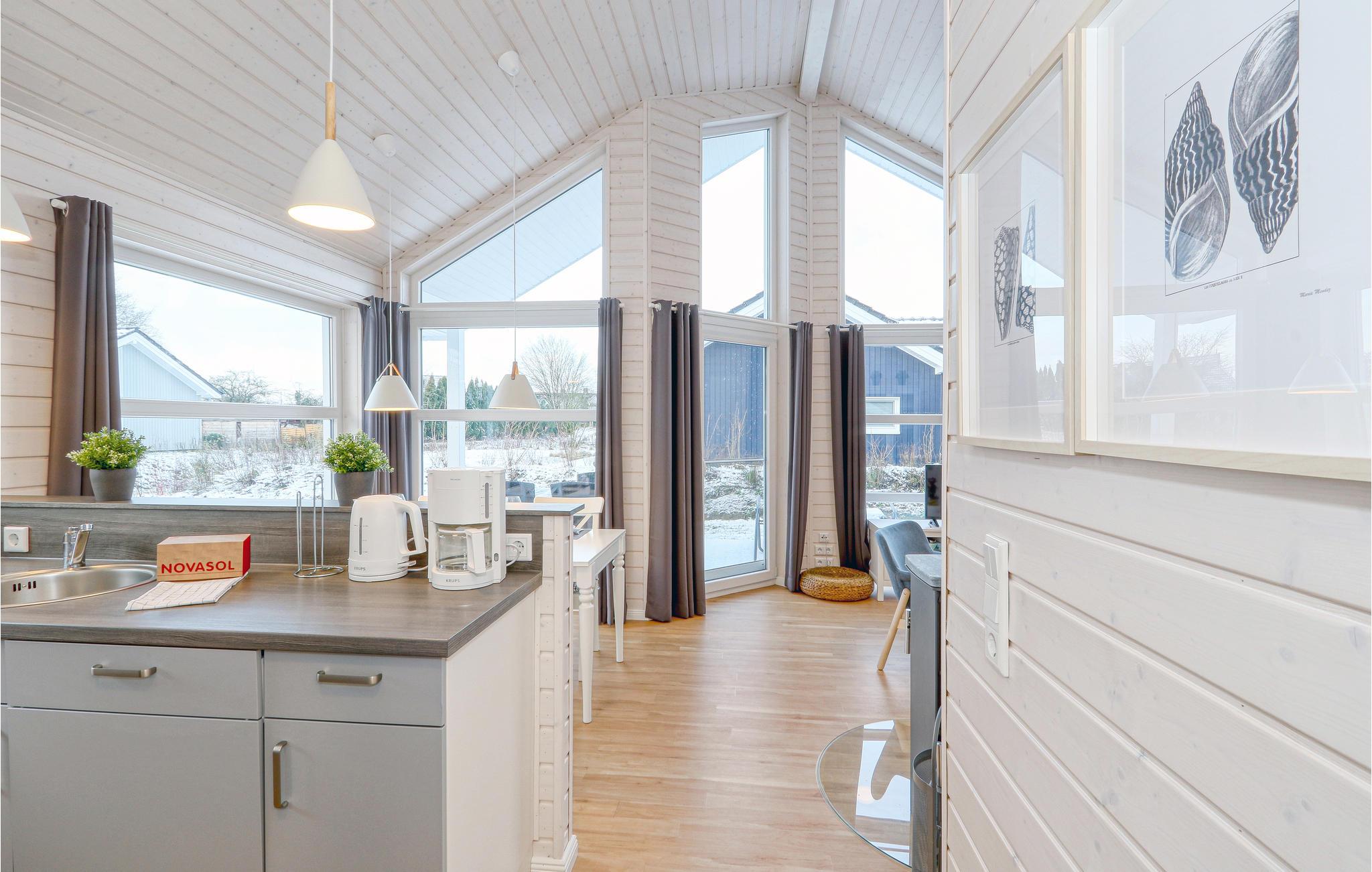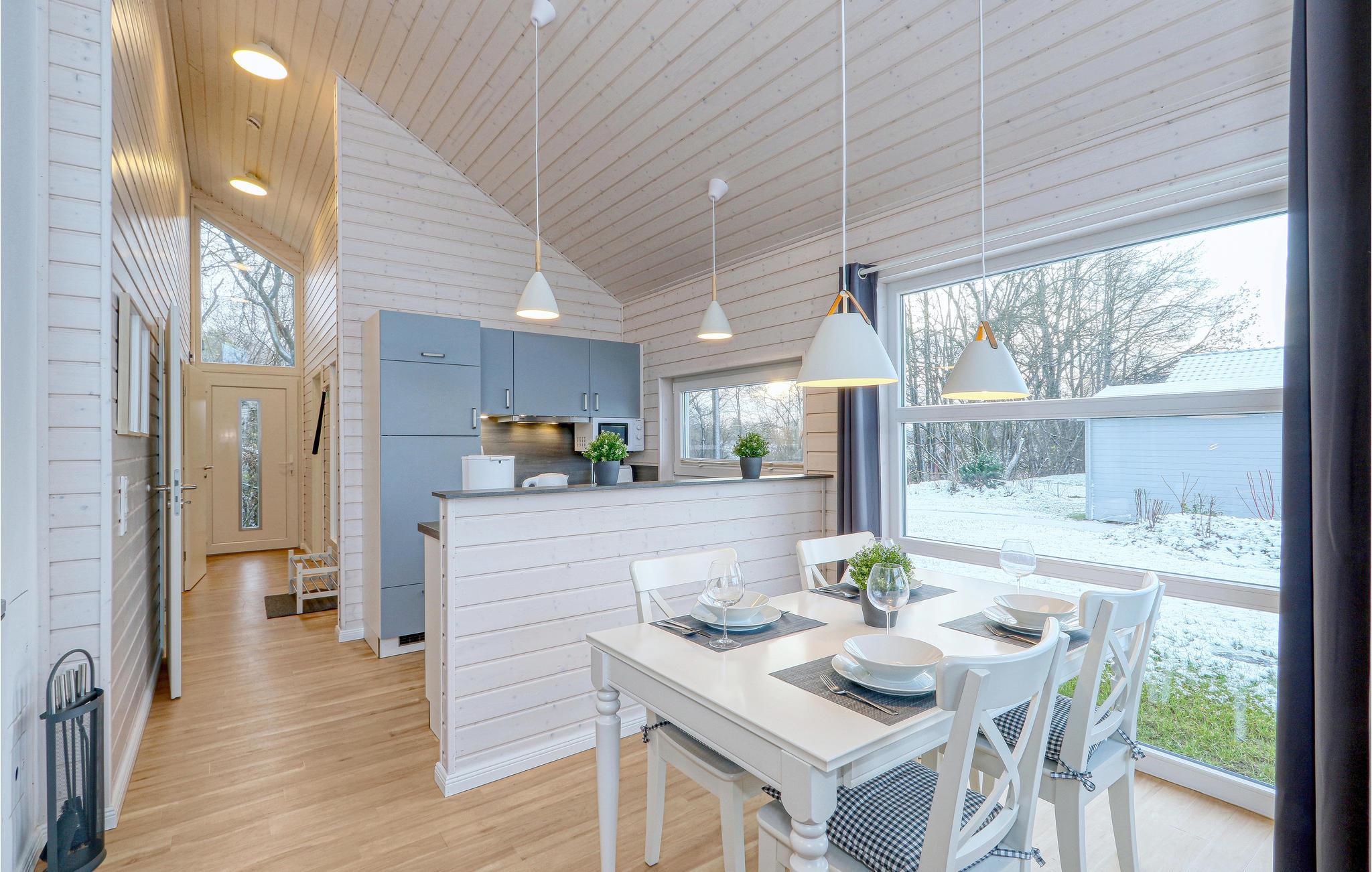 Det moderne træhus "Waldfrieden" imponerer med sin skandinaviske stil og har plads nok til fire voksne og to børn. På grund af det første høje åbne loft kan I nyde en behagelig rumfølelse og lyse rum. De maritime møbler i lyse toner øger komforten.