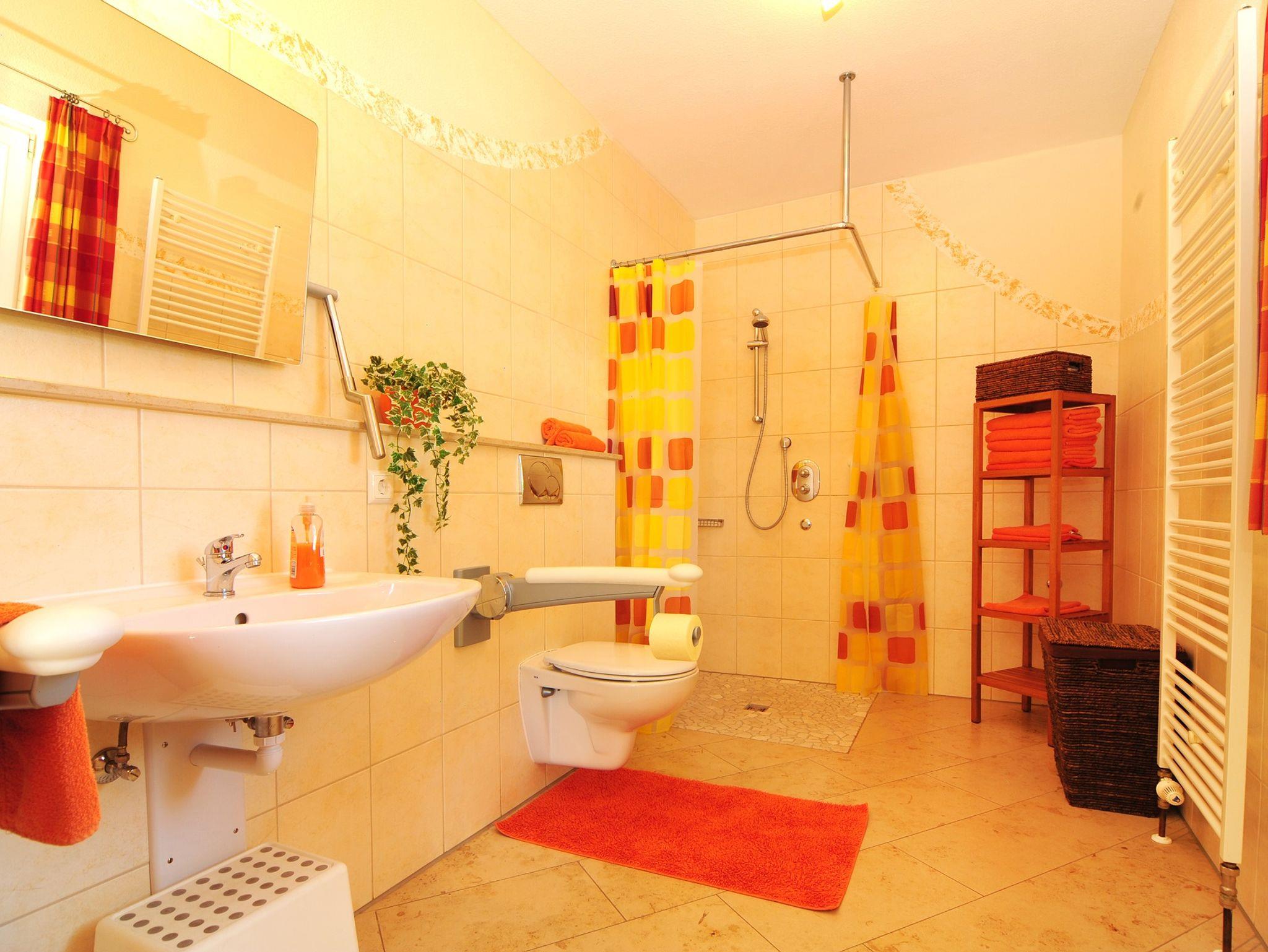 Das Bad verfügt über eine befahrbare Dusche.