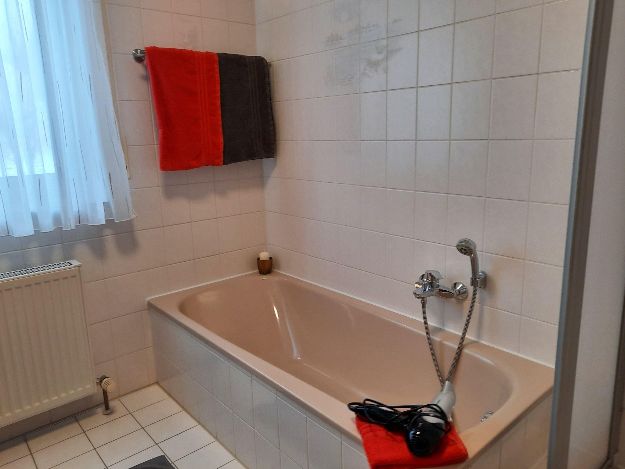 2 Waschbecken, Dusche, Badewanne und Föhn.