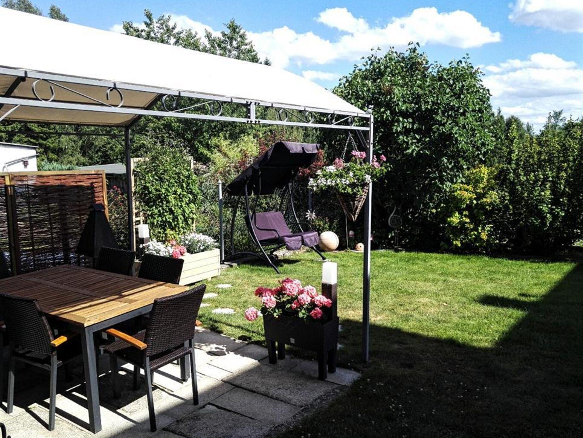 Garten mit mit überdachten Freisitz und Grill, Liegewiese, Sat-TV. Wäsche wird gestellt.