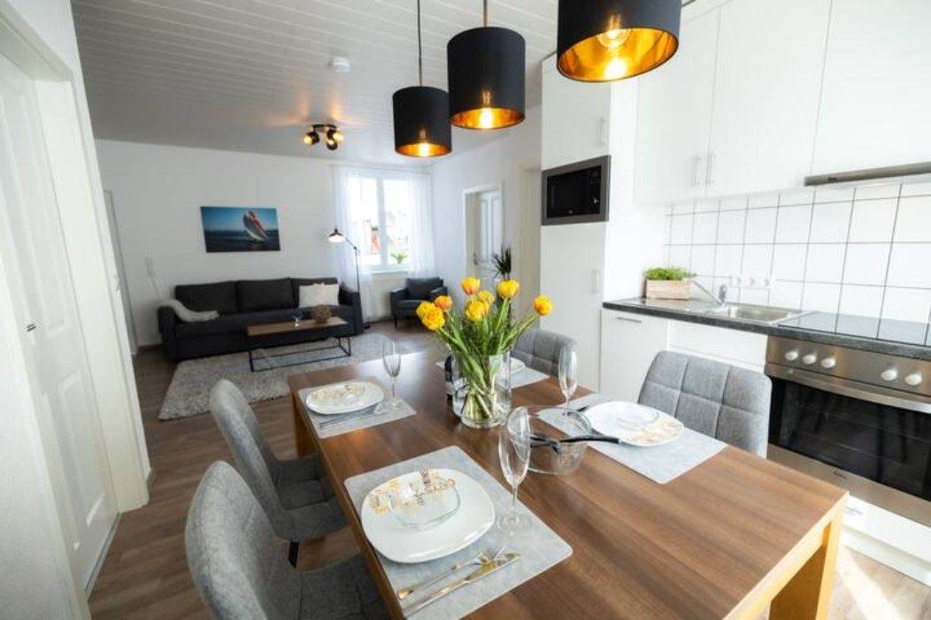 Das großzügige Apartment Nummer 2 bietet Platz für bis zu 4 Personen und besticht durch seine geschmackvolle und moderne Einrichtung. Beim Betreten finden Sie einen offenen Wohn-Essbereich vor, der zum Verweilen und Entspannen einlädt. Die voll ausgestattete Küche ermöglicht es Ihnen, Ihre Mahlzeiten bequem zuzubereiten und Ihre Lieblingsgerichte zu genießen. Das Apartment verfügt über zwei separate Schlafzimmer, was es ideal für Familien, Freunde oder Paare macht, die Privatsphäre schätzen. Für diejenigen, die im Freien entspannen möchten, gibt es eine gemeinsame Terrasse, die mit Apartment Nummer 3 geteilt wird. Diese Terrasse ist geschickt mit Pflanzen und einem Grill ausgestattet, um angenehme Abende im Freien zu ermöglichen, sei es für gesellige Spieleabende oder gemeinsame Stunden mit Freunden und Familie.